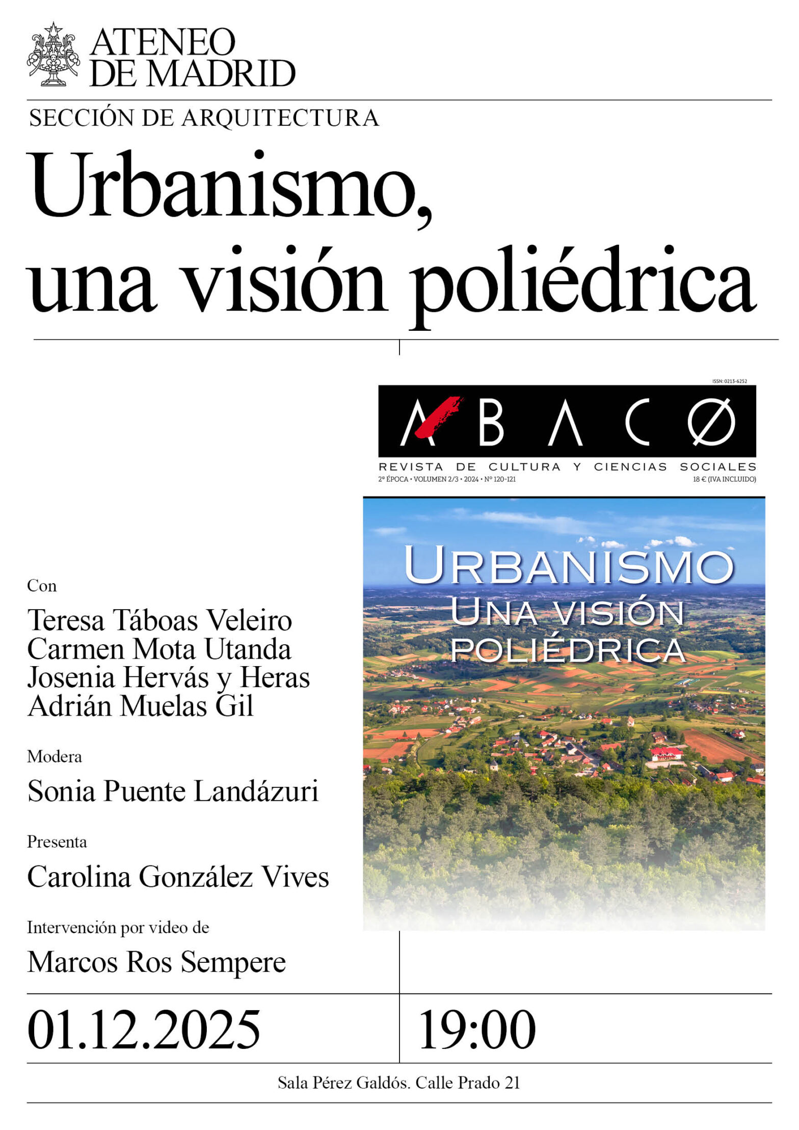 Sección de Arquitectura. Intervienen: Teresa Táboas Veleiro, doctora arquitecta y vicepresidenta de la Unión Internacional de Arquitectos; Carmen Mota Utanda, doctora arquitecta, profesora de urbanismo de la Escuela de Arquitectura de Toledo; Josenia Hervás Heras, doctora arquitecta y profesora investigadora de la Escuela de Arquitectura de Alcalá de Henares y CESUGA;  y Adrián Muelas Gil, subdirector General de Coordinación e Iniciativas contra la despoblación. MITECO. Modera: Sonia Puente Landázuri, arquitecta e investigadora y coordinadora del monográfico. Presenta: Carolina González Vives. Intervención por video de Marcos Ros Sempere, eurodiputado. Sala Pérez Galdós. 19:00h.
