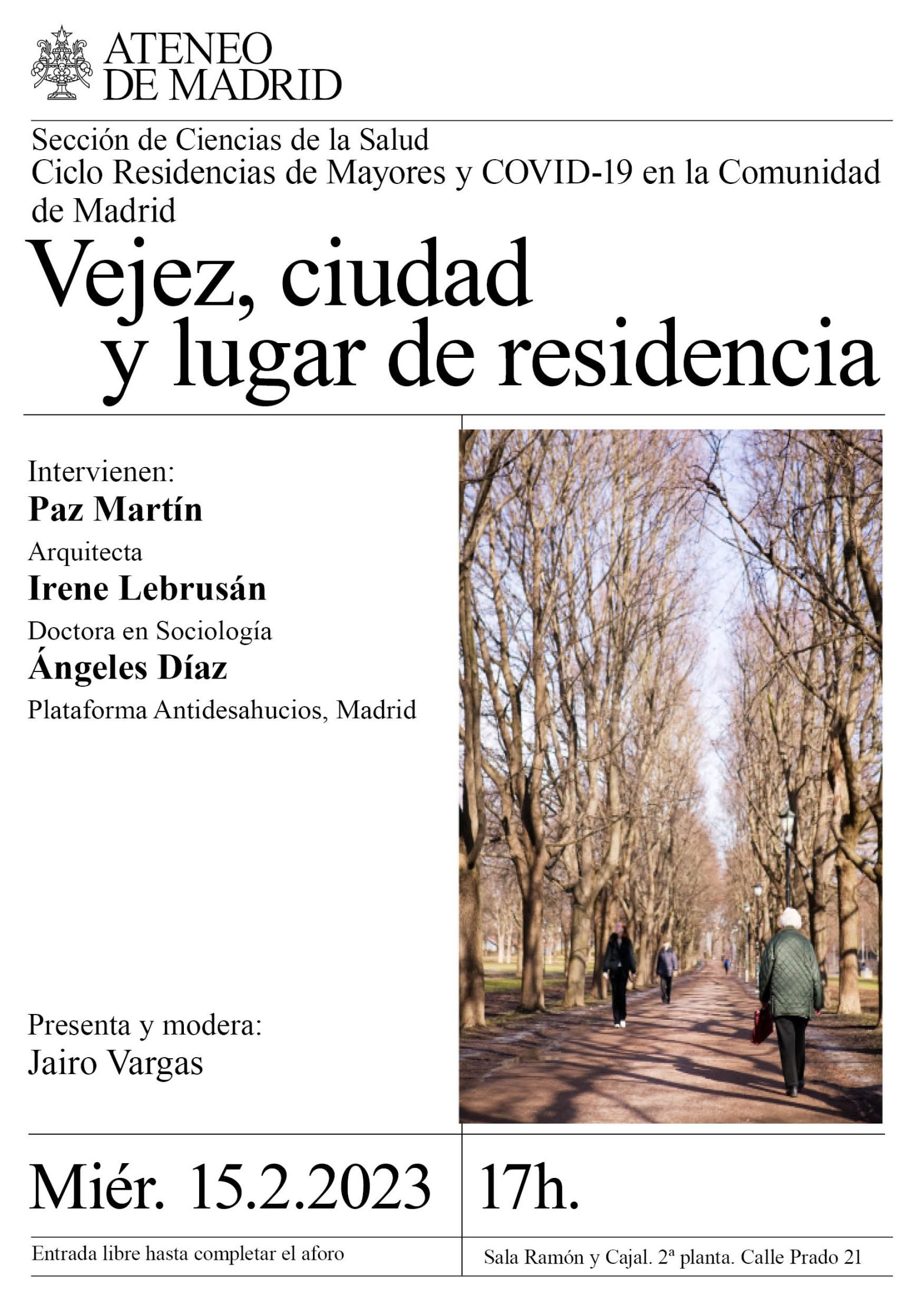 Sección de Ciencias de la Salud. Ciclo Residencias de Mayores y COVID-19 en la Comunidad de Madrid. Intervienen: Paz Martín, arquitecta; Irene Lebrusán, doctora en Sociología; Ángeles Díaz, Plataforma Antidesahucios, Madrid; Presenta y modera: Jairo Vargas, periodista de público. Sala Ramón y Cajal. 17h.