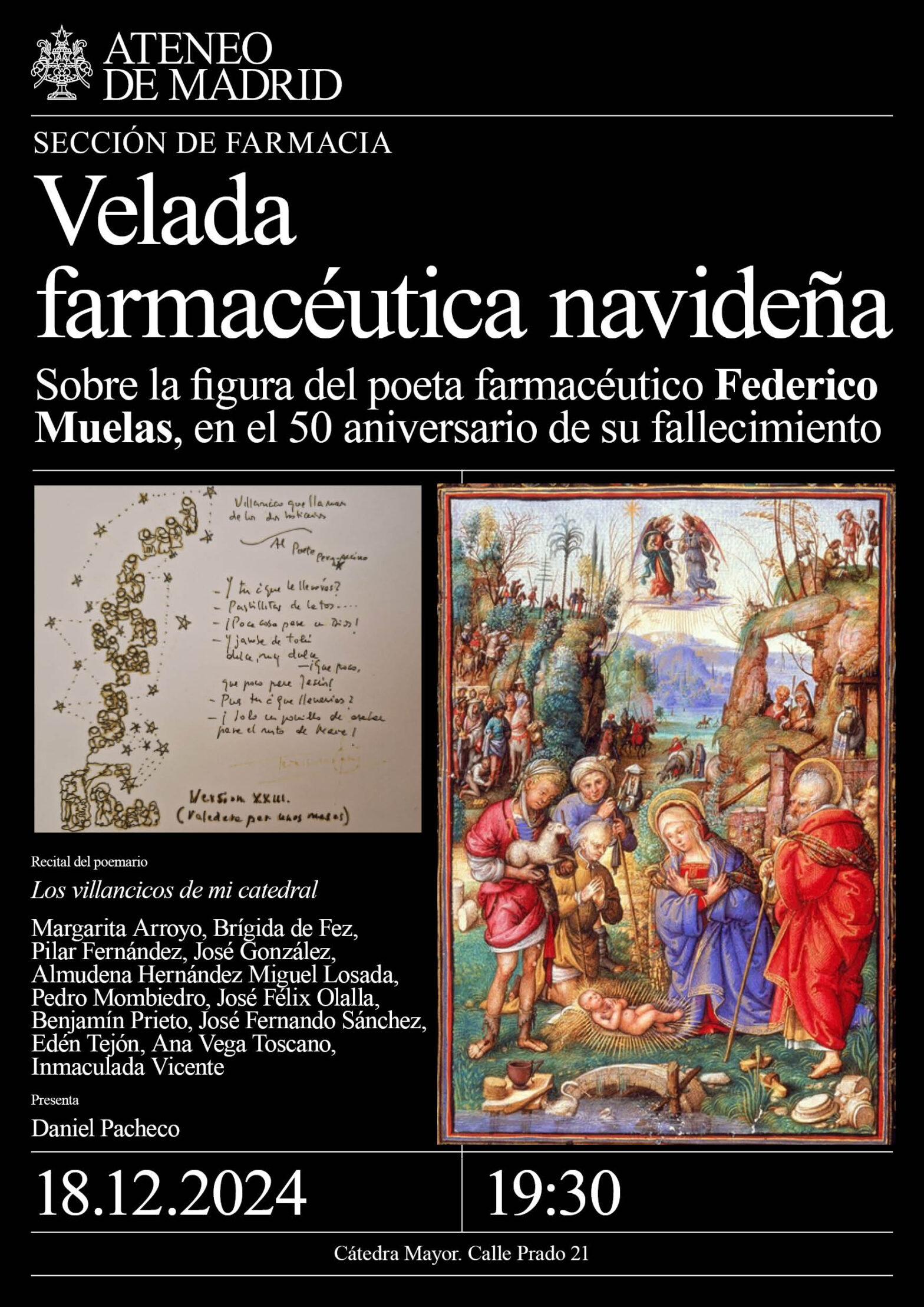 Sección de Farmacia. Recital del poemario Los villancicos de mi catedral por: Margarita Arroyo, Brígida de Fez, Pilar Fernández, José González, Almudena Hernández, Miguel Losada, Pedro Mombiedro, José Félix Olalla, Benjamín Prieto, José Fernando Sánchez, Edén Tejón, Ana Vega Toscano, Inmaculada Vicente. Presenta y coordina: Daniel Pacheco. Cátedra Mayor. 19:30h.