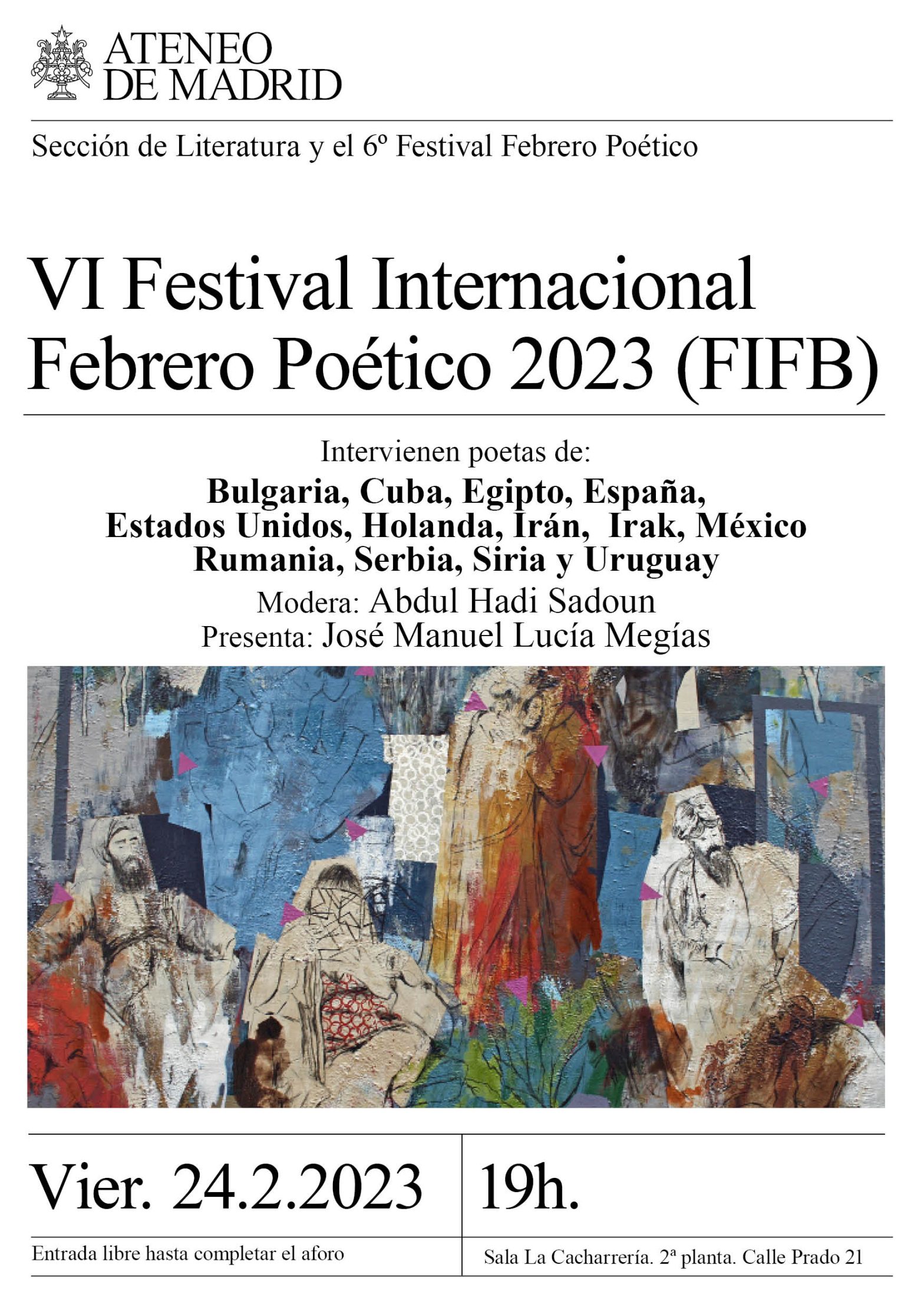 Sección de Literatura y el 6º Festival Febrero Poético. Intervienen poetas de: Bulgaria, Cuba, Egipto, España, Estados Unidos, Holanda, Irán, Irak, México, Rumania, Serbia, Siria y Uruguay. Modera: Abdul Hadi Sadoun. Preside: José Manuel Lucía Megías. Sala la Cacharrería. 19h.
