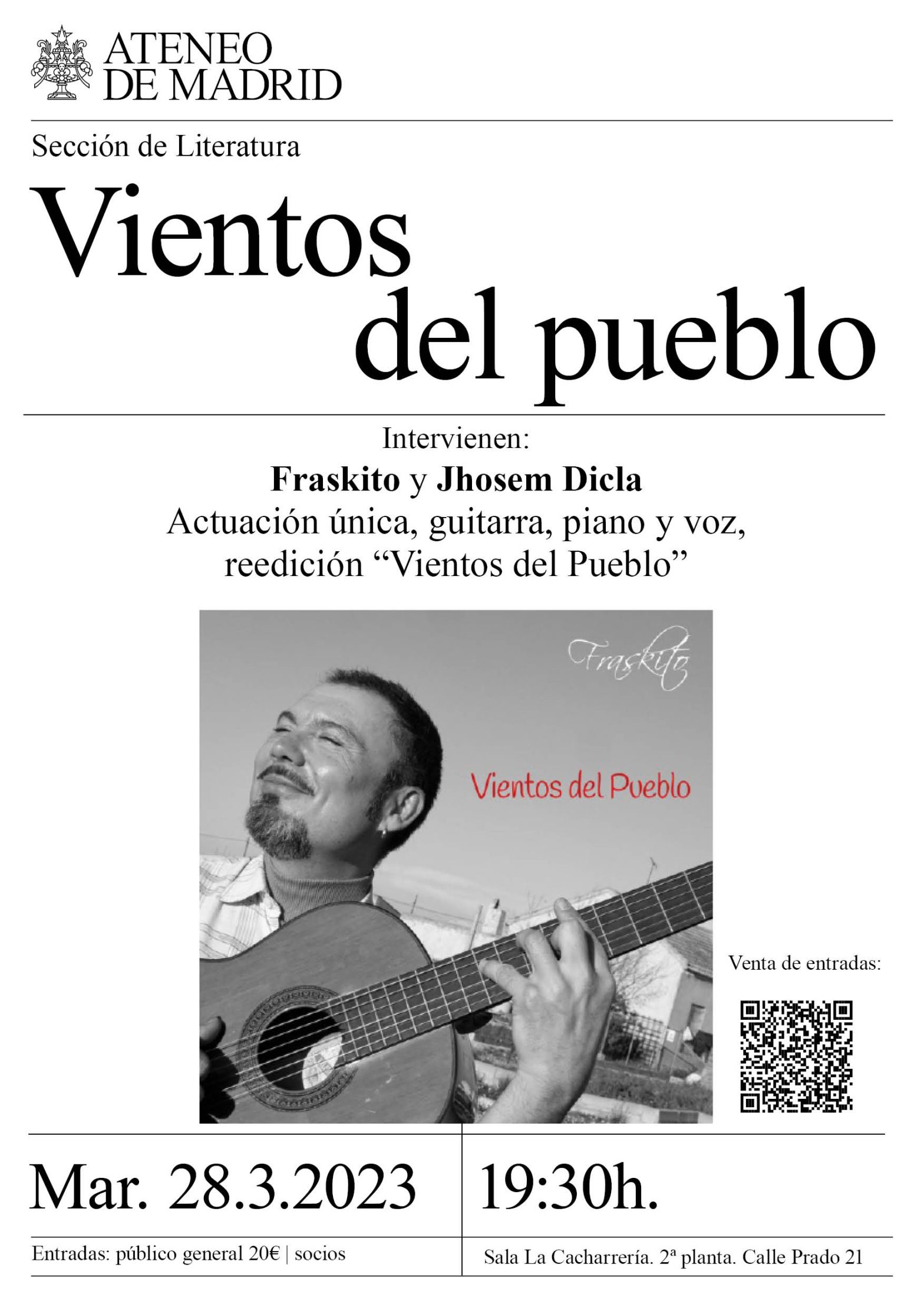 Sección de Literatura. Intervienen: Fraskito y Jhosem Dicla. Actuación única, guitarra, piano y voz, reedición “Vientos del Pueblo”. Sala La Cacharrería. 19:30h.