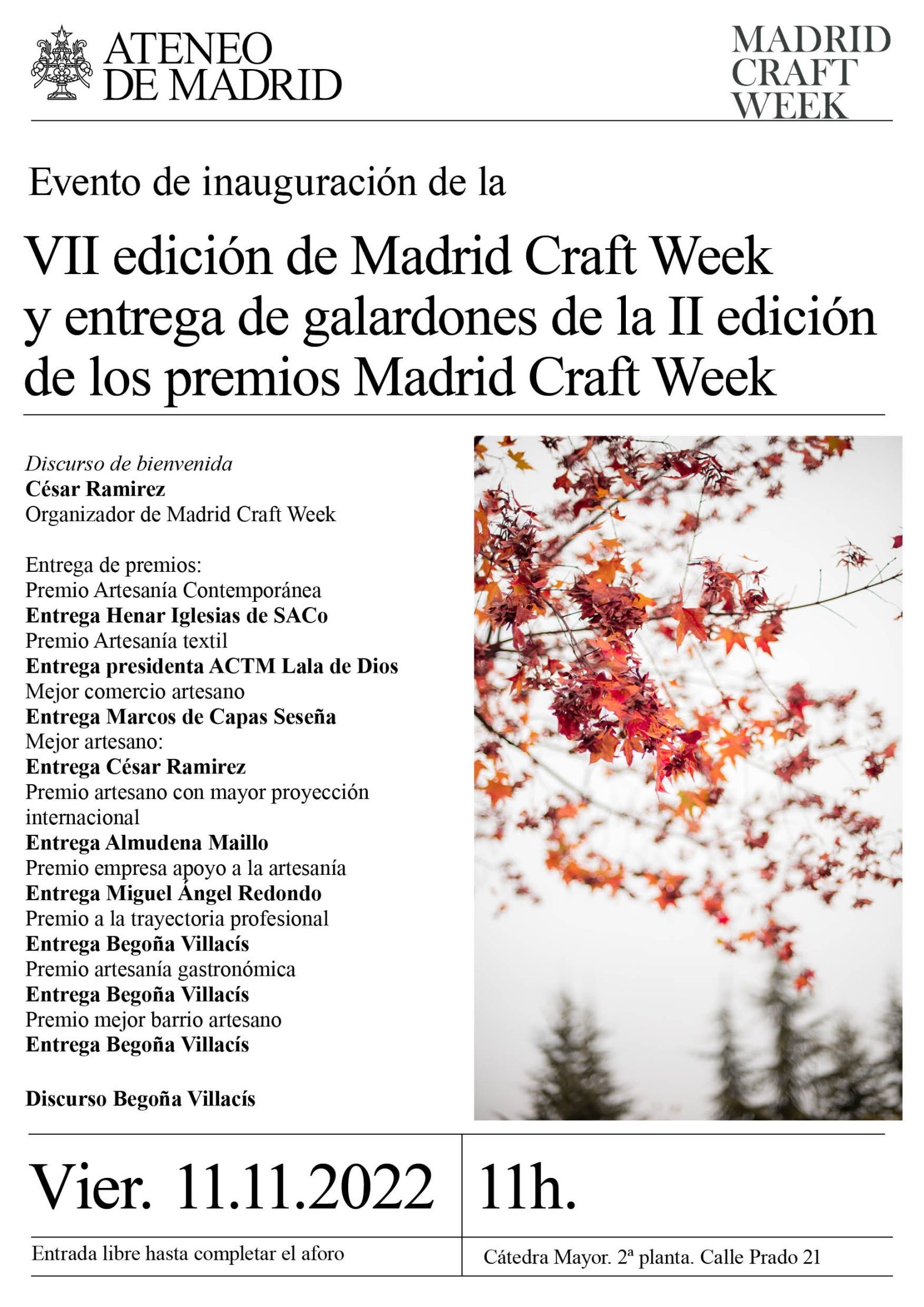 VII edición de Madrid Craft Week y entrega de galardones de la II edición de los premios Madrid Craft Week. Discurso de bienvenida, a cargo de César Ramirez, organizador de Madrid Craft Week. entrega de premios: .Premio Artesanía Contemporánea: entrega Henar Iglesias de SACo. Premio Artesanía textil: Entrega presidenta ACTM Lala de Dios. Mejor comercio artesano: entrega Marcos de Capas Seseña. Mejor artesano: entrega César Ramirez. Premio artesano con mayor proyección internacional: entrega Almudena Maillo. Premio empresa apoyo a la artesanía: entrega Miguel Ángel Redondo. Premio a la trayectoria profesional: entrega Begoña Villacís. Premio artesanía gastronómica: entrega Begoña Villacís. Premio mejor barrio artesano: entrega Begoña Villacís. Discurso Begoña Villacís.