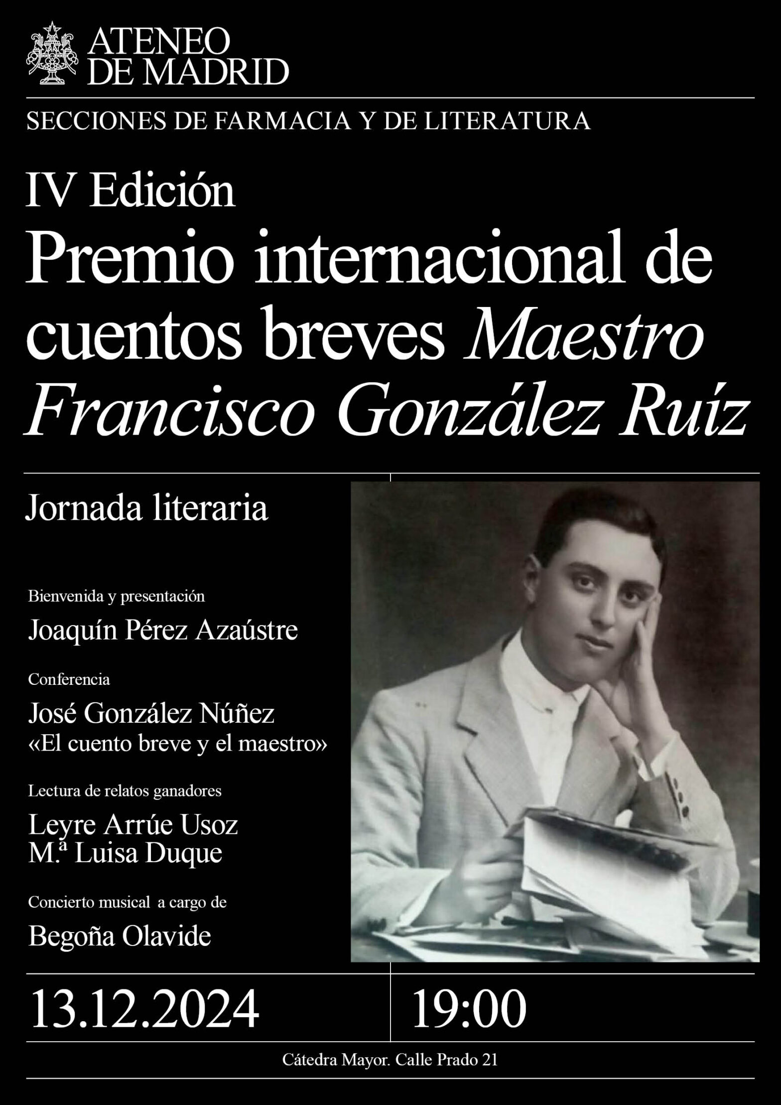 Secciones de Farmacia y de Literatura. Bienvenida y presentación: Joaquín Pérez Azaústre. Conferencia: José González Núñez «El cuento breve y el maestro». Lectura de relatos ganadores: Leyre Arrúe Usoz y M.ª Luisa Duque. Concierto Musical a cargo de: Begoña Olavide. Cátedra Mayor. 19:00h.