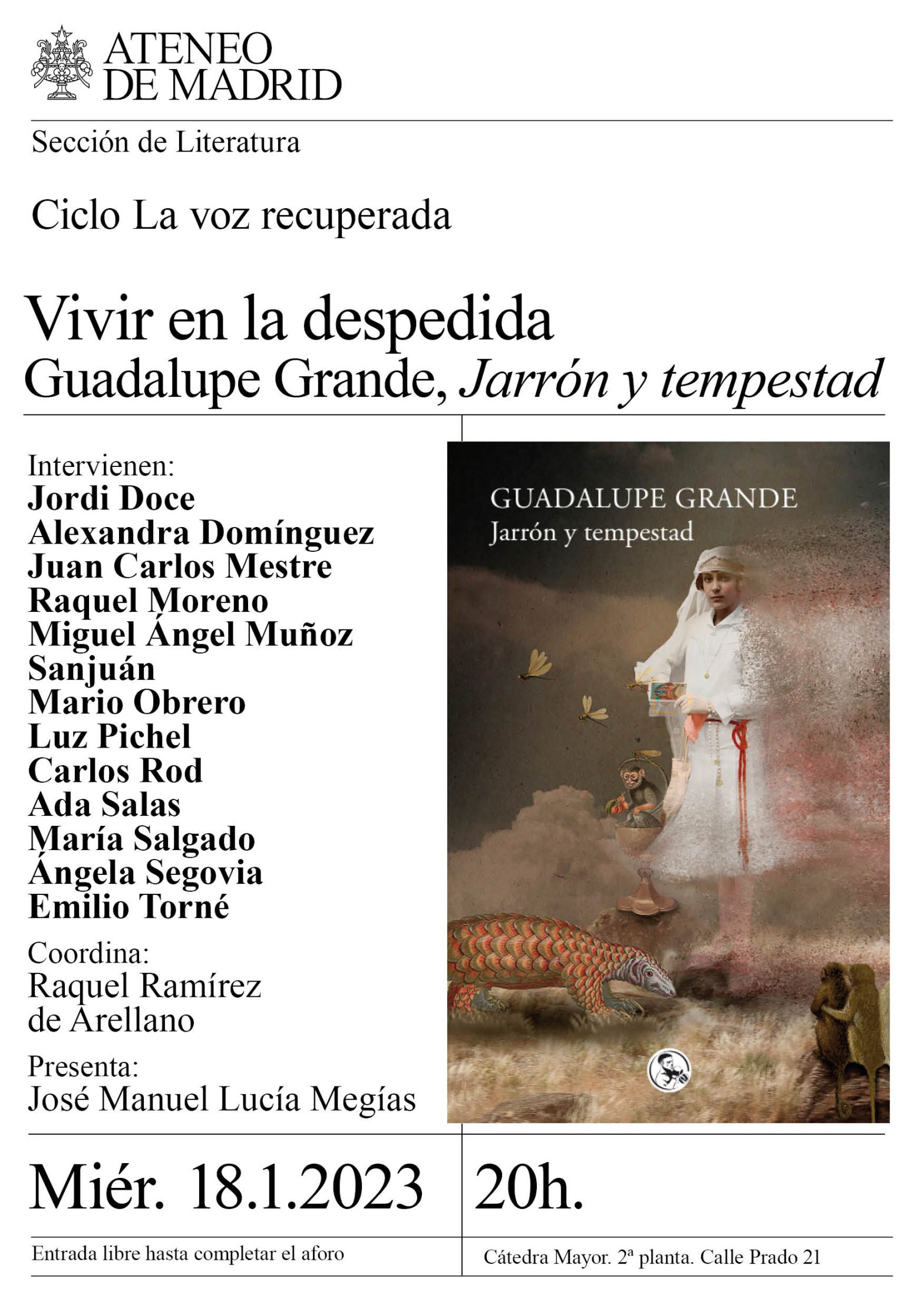 Sección de Literatura. Homenaje a Guadalupe Grande. Intervienen: Jordi Doce, Alexandra Domínguez, Juan Carlos Mestre, Raquel Moreno, Miguel Ángel Muñoz Sanjuán, Mario Obrero, Luz Pichel, Carlos Rod, Ada Salas, María Salgado, Ángela Segovia, Emilio Torné. Coordina Raquel Ramírez de Arellano. Presenta: José Manuel Lucía Megías. Cátedra Mayor. 20 h.