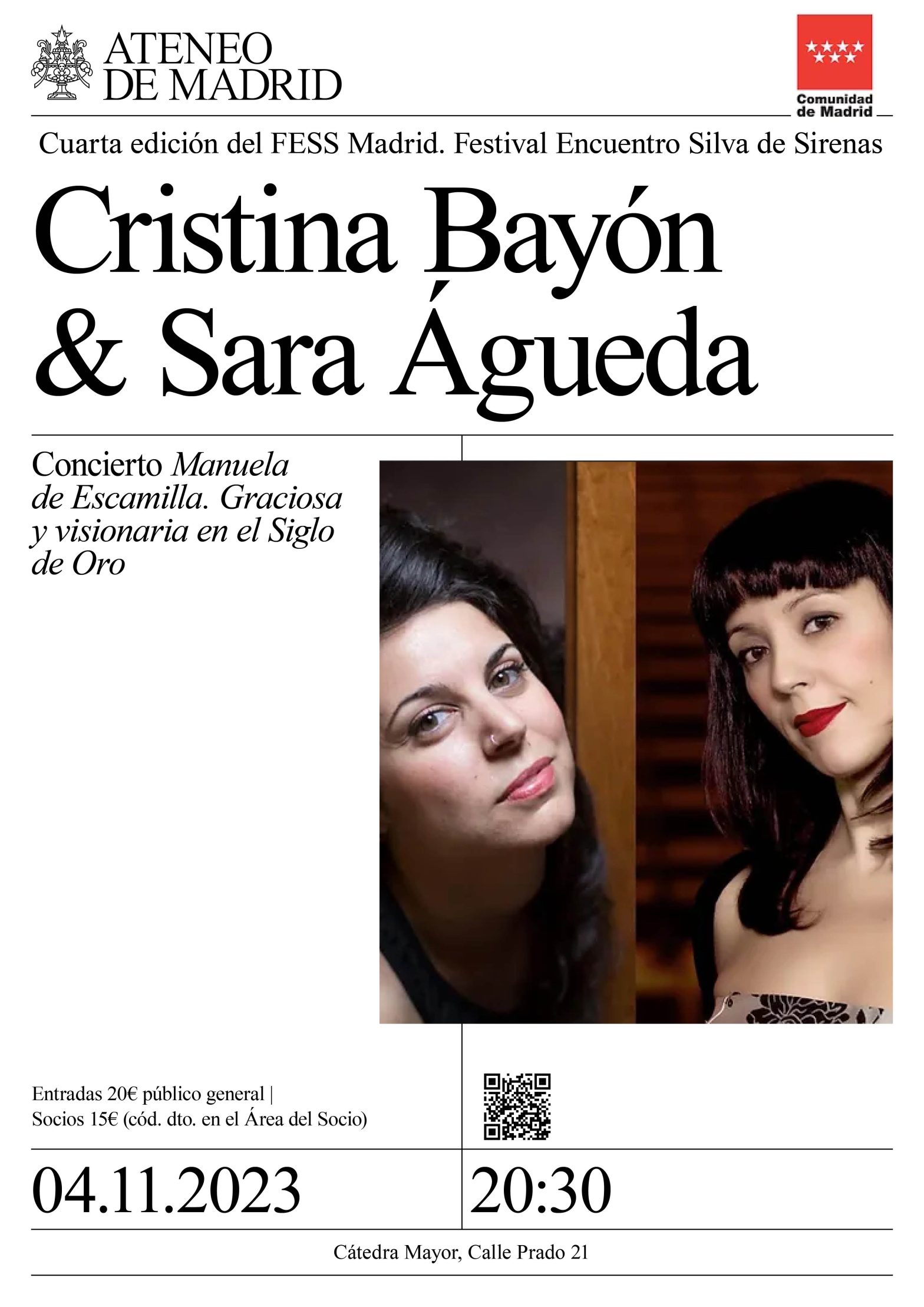 Ateneo de Madrid / Concierto 20:30 h. Concierto Manuela de Escamilla. Graciosa y visionaria en el Siglo de Oro. Cristina Bayón (soprano) & Sara Águeda (arpa de dos órdenes) Bio y programa.