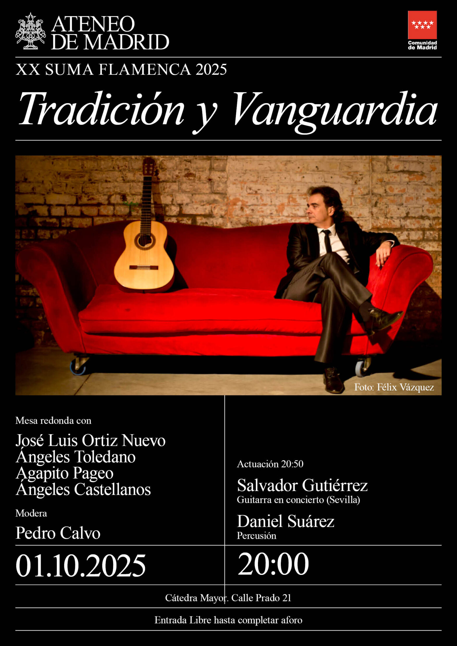 Mesa redonda: Tradición y Vanguardia. Con: José Luis Ortiz Nuevo, Ángeles Toledano, Agapito Pageo y Ángeles Castellanos. Modera: Pedro Calvo (+info). 20:50 Actuación: Salvador Gutiérrez, guitarra en concierto (Sevilla) y Daniel Suárez, percusión. (+info).
