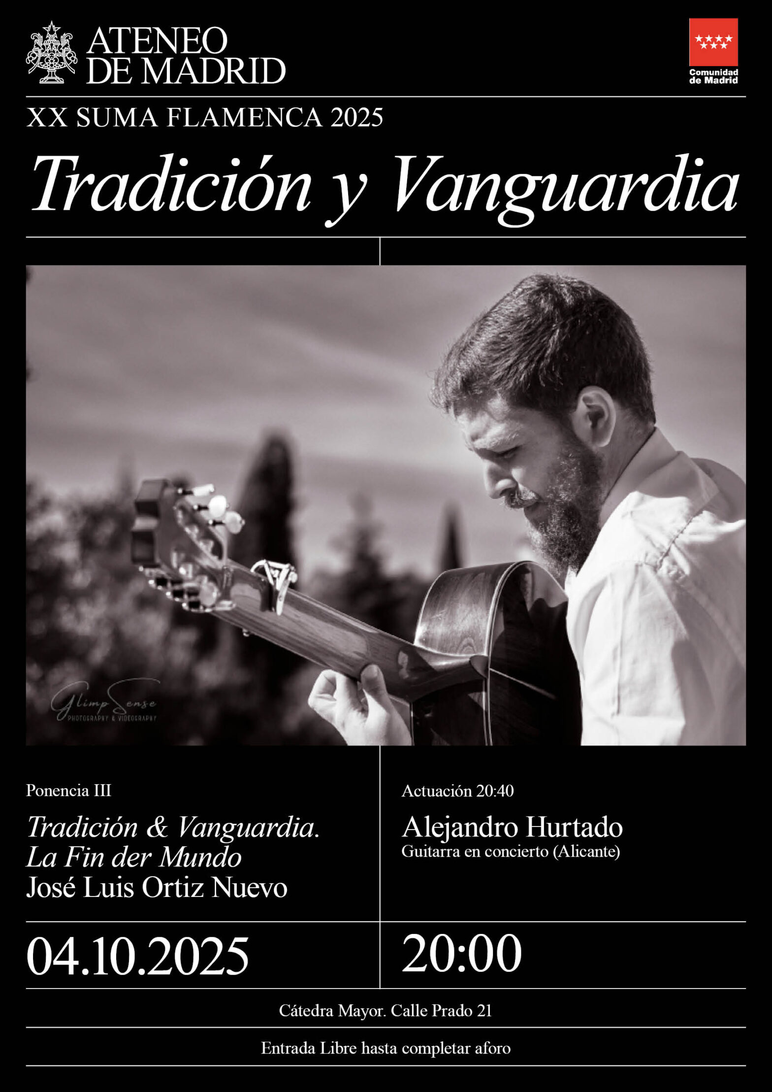 Ponencia III: Tradición & Vanguardia. La Fin der MundoJosé Luis Ortiz Nuevo, escritor y creador de la Bienal de Flamenco de Sevilla. (+info). 20:40 Actuación: Alejandro Hurtado, guitarra en concierto (Alicante). (+info).
