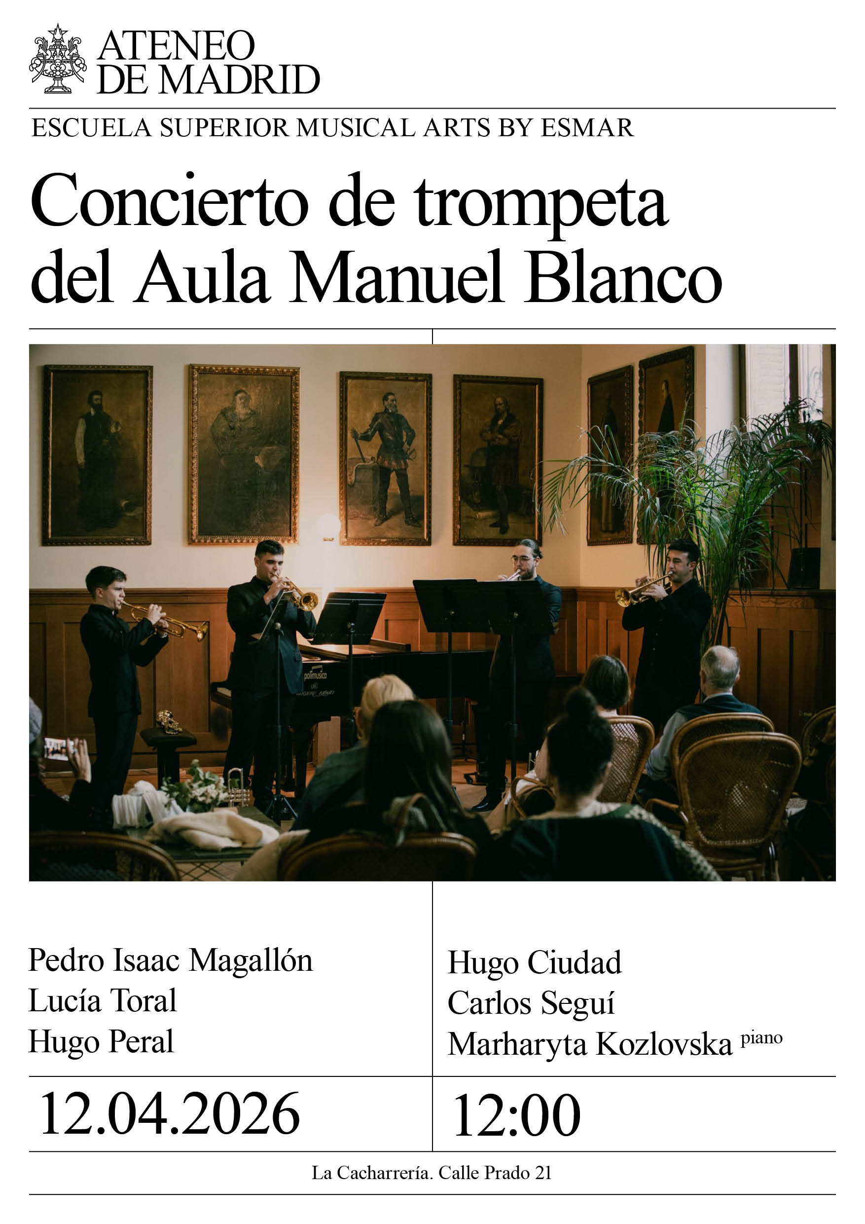 Escuela Superior Musical Arts by ESMAR. La Cacharrería. 12:00h. Programa: Légende George Enescu.- Pedro Isaac Magallón Intrada Arthur Honegger.- Lucía Toral Concierto para trompeta y orquesta en La b M Alexander Arutunian.- Hugo Peral Concierto para trompeta, cuerdas y piano André Jolivt.- Hugo Ciudad Zelda Caprice Percy Code.- Carlos Seguí Fantasie Caprice Gabriel Parès.- Lucía Toral Marharyta Kozlovska, piano