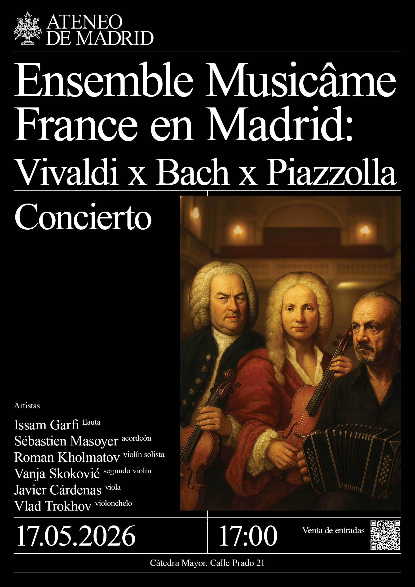 Venta de entradas (aquí) Socios código descuento en el Área del Socio. Artistas: Issam Garfi, flauta; Sébastien Masoyer, acordeón; Roman Kholmatov, violín solista; Vanja Skoković, segundo violín; Javier Cárdenas, viola; y Vlad Trokhov, violonchelo. Cátedra Mayor. 17:00h. Programa: A.Piazzolla: Primavera porteña J.S.Bach: Suite pour flûte en Si min ( Polonaise, Menuet, Badinerie) J.S.Bach: Concerto pour …