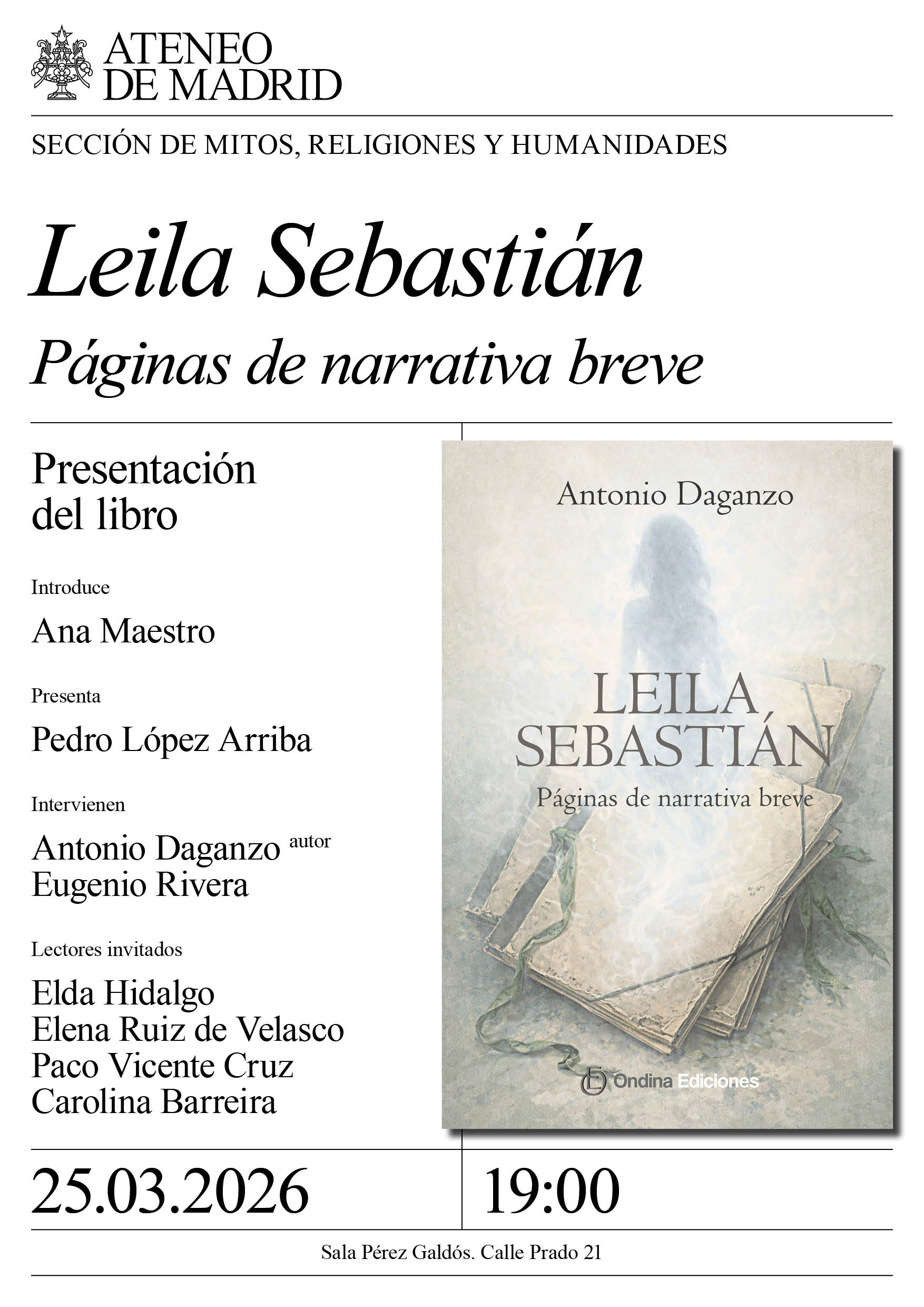 Sección de Mitos, Religiones y Humanidades. Introduce: Ana Maestro. Presenta: Pedro López Arriba. Interviene: Eugenio Rivera y Antonio Daganzo, autor. Lectores invitados: Elda Hidalgo, Elena Ruiz de Velasco, Paco Vicente Cruz y Carolina Barreira. Sala Pérez Galdós. …