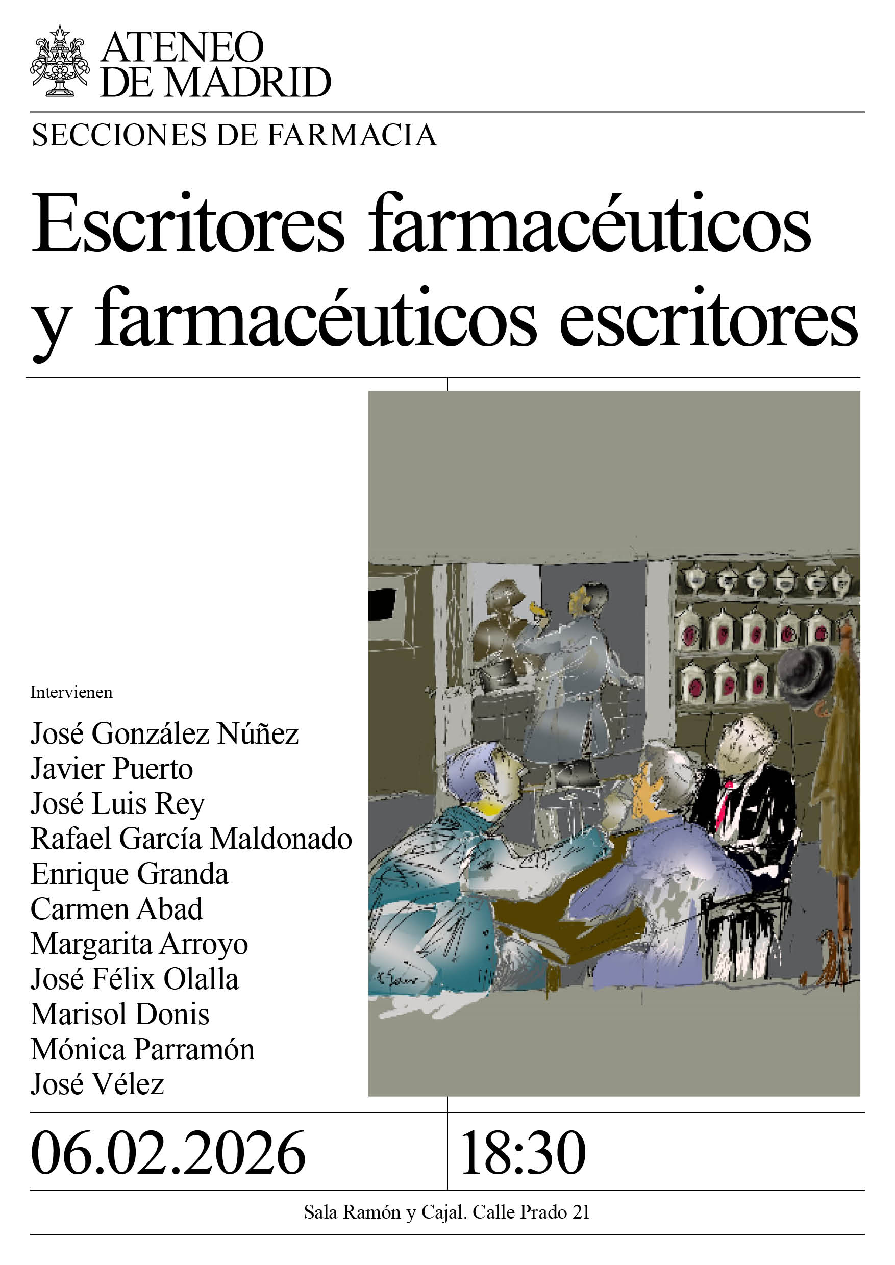 Sección de Farmacia. 1ª parte: De Georg Trakl y Fernando Plata a Rafael García Plata. Intervienen: José González Núñez, Javier Puerto, José Luis Rey, Rafael García Maldonado. 2ª parte Lectura de Textos: Enrique Granda, Carmen Abad, Margarita Arroyo, José Félix Olalla, Marisol Donis, Mónica Parramón y José Vélez. Sala Ramón y Cajal. 18:30h.