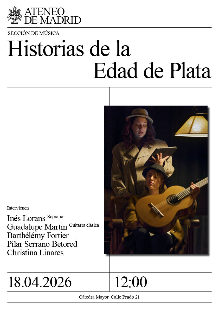 Sección de Música. Intervienen: Inés Lorans, soprano; Guadalupe Martín, guitarra clásica; Barthélémy Fortier. Seguido de un breve intercambio con el público, con la participación de: Pilar Serrano Betored, UAM y Christina Linares, Editorial Renacimiento. Cátedra Mayor. 12:00h.