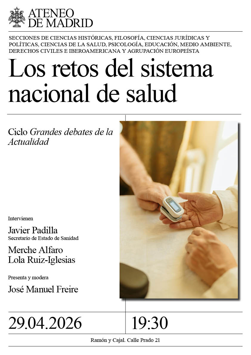 Secciones de Ciencias Históricas, Filosofía, Ciencias Jurídicas y Políticas, Ciencias de la Salud, Psicología, Ciencias de la Educación, Medio Ambiente, Derechos Civiles e Iberoamericana y la Agrupación Europeísta Cuidar el Futuro. Intervienen: Javier Padilla, secretario de Estado de Sanidad; Merche Alfaro, subdirectora general de Información Sanitaria; Lola Ruiz-Iglesias, consultora sanitaria. Presenta y modera: José Manuel Freire. Sala Ramón y Cajal. 19:30h.