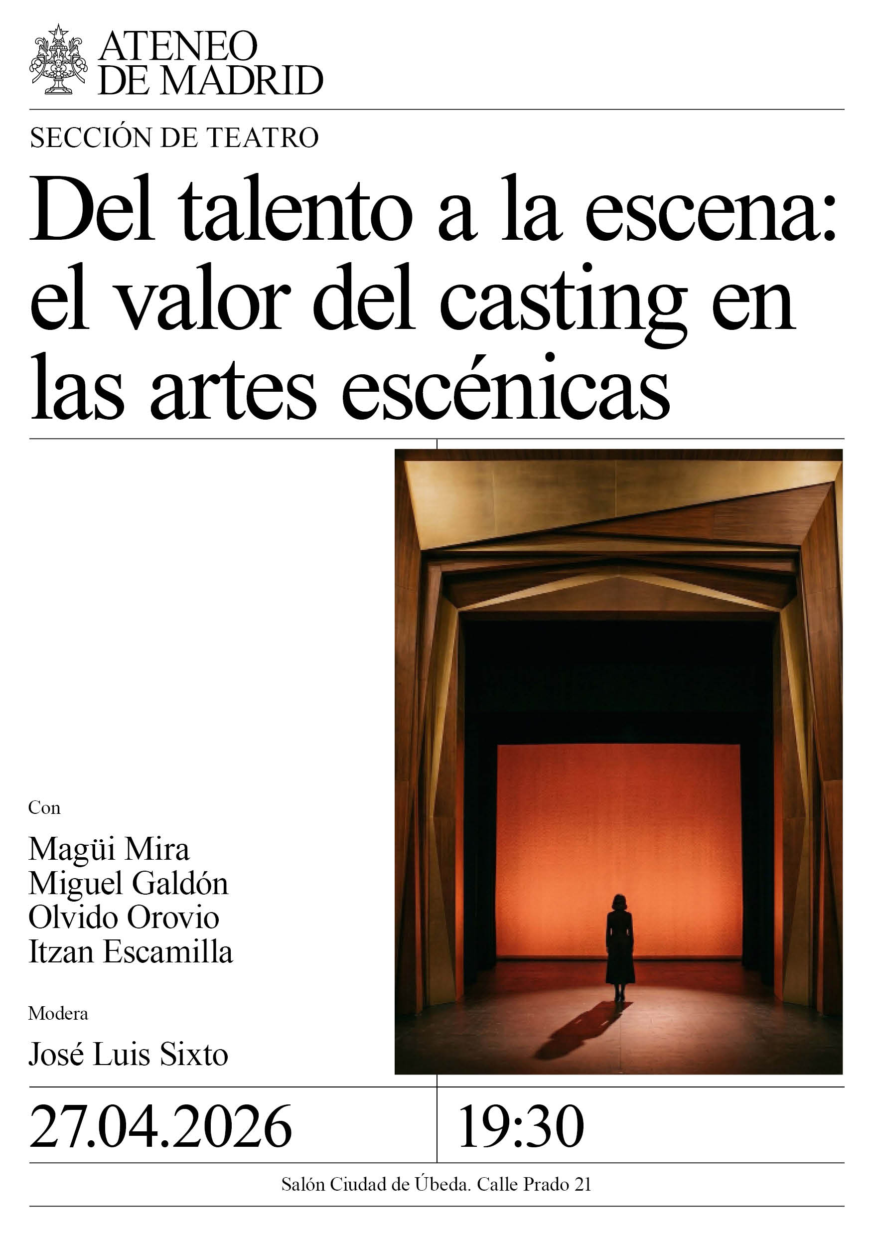 Sección de Teatro. Con: Magüi Mira, Miguel Galdón, Olvido Orovio e Itzan Escamilla. Modera: José Luis Sixto. Salón Ciudad de Úbeda. 19:30h.