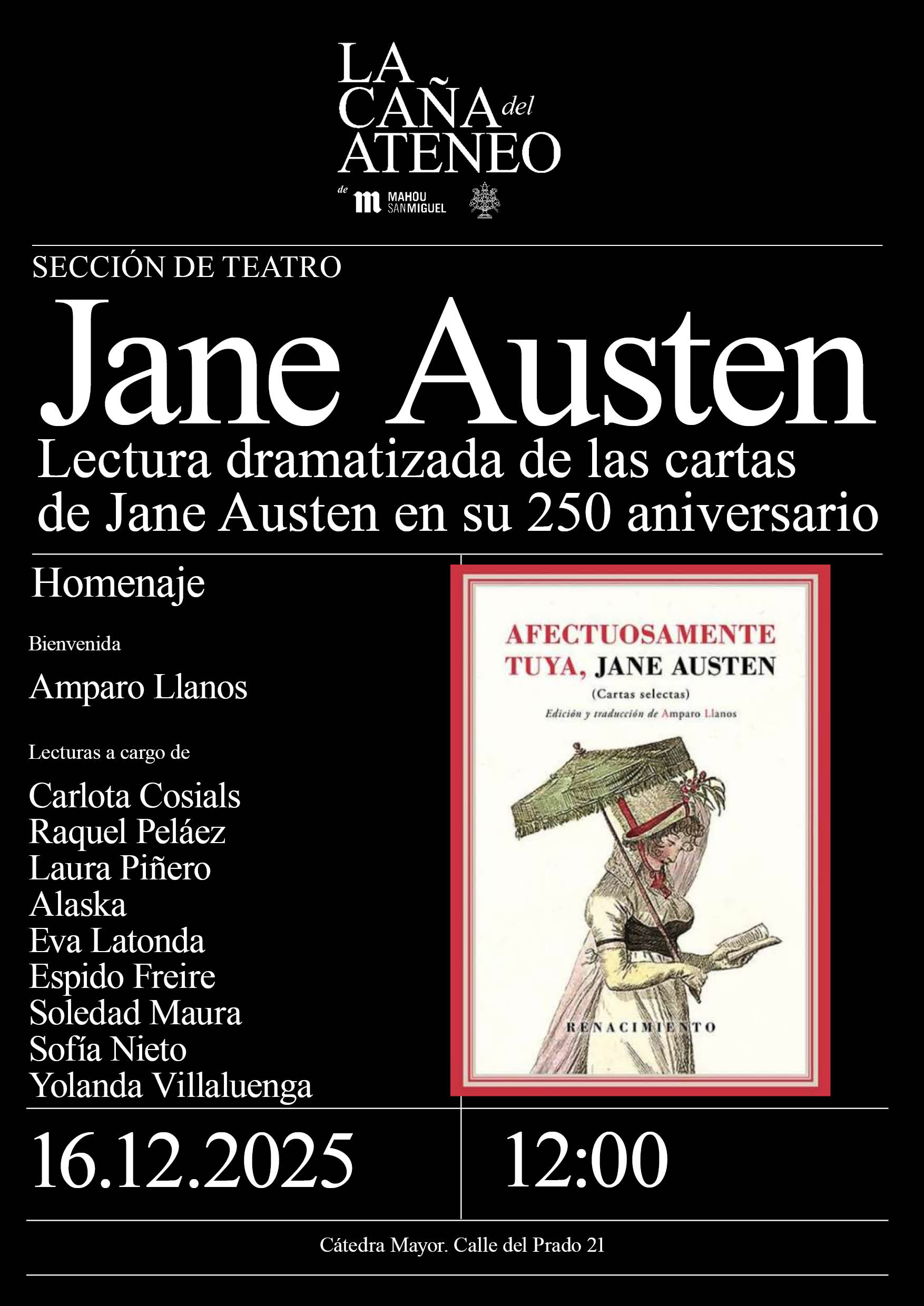 Lectura dramatizada de las cartas de Jane Austen en su 250 aniversario. Entrada libre hasta completar aforo. La Caña del Ateneo. Bienvenida: Carlota Cosials, líder del grupo Hinds; Raquel Peláez, …