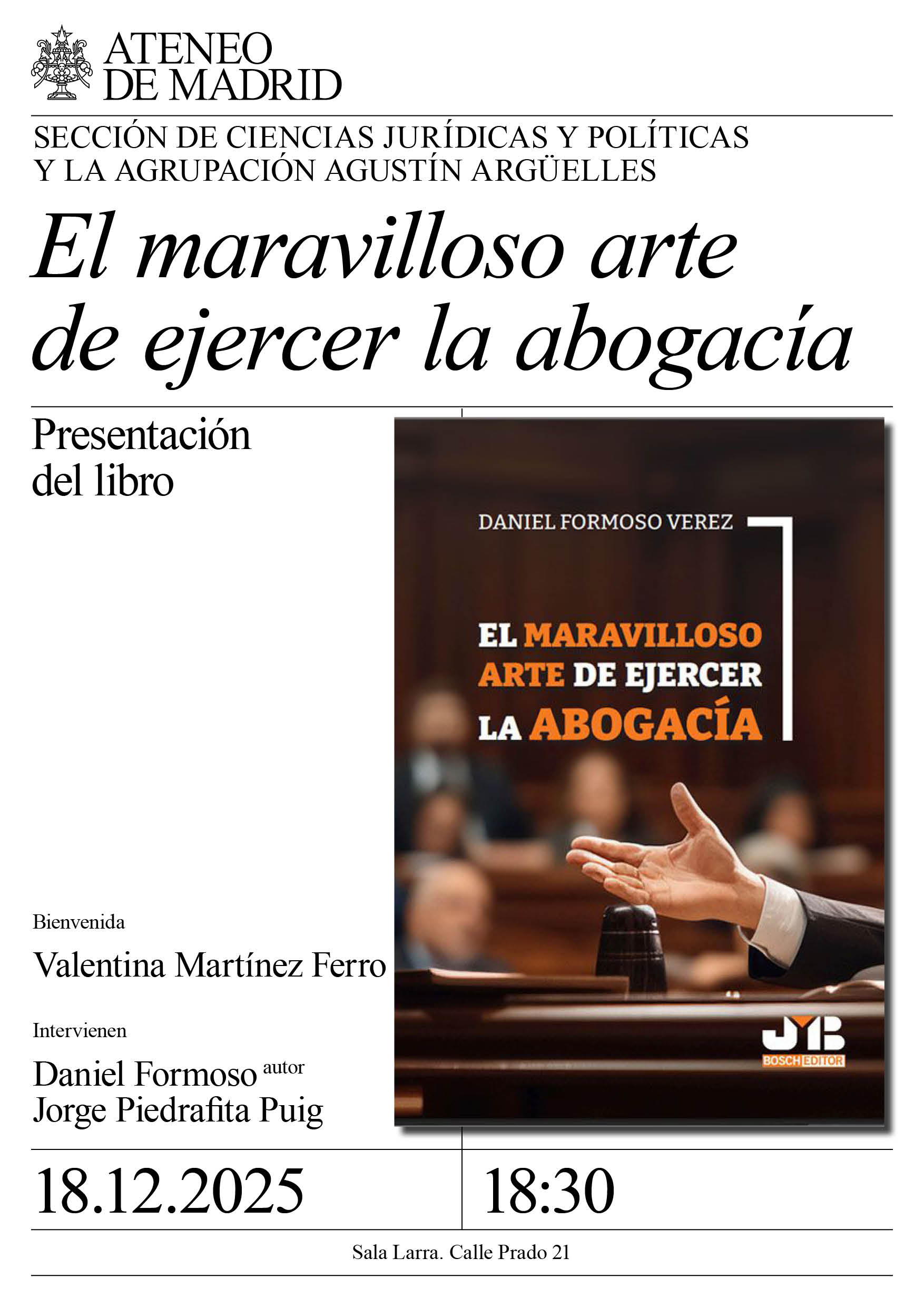 Sección de Ciencias Jurídicas y Políticas y la Agrupación Agustín Argüelles. Bienvenida: Valentina Martínez Fierro. Intervienen: Daniel Formoso, autor; Jorge Piedrafita Puig. Sala Larra. 18:30h.
