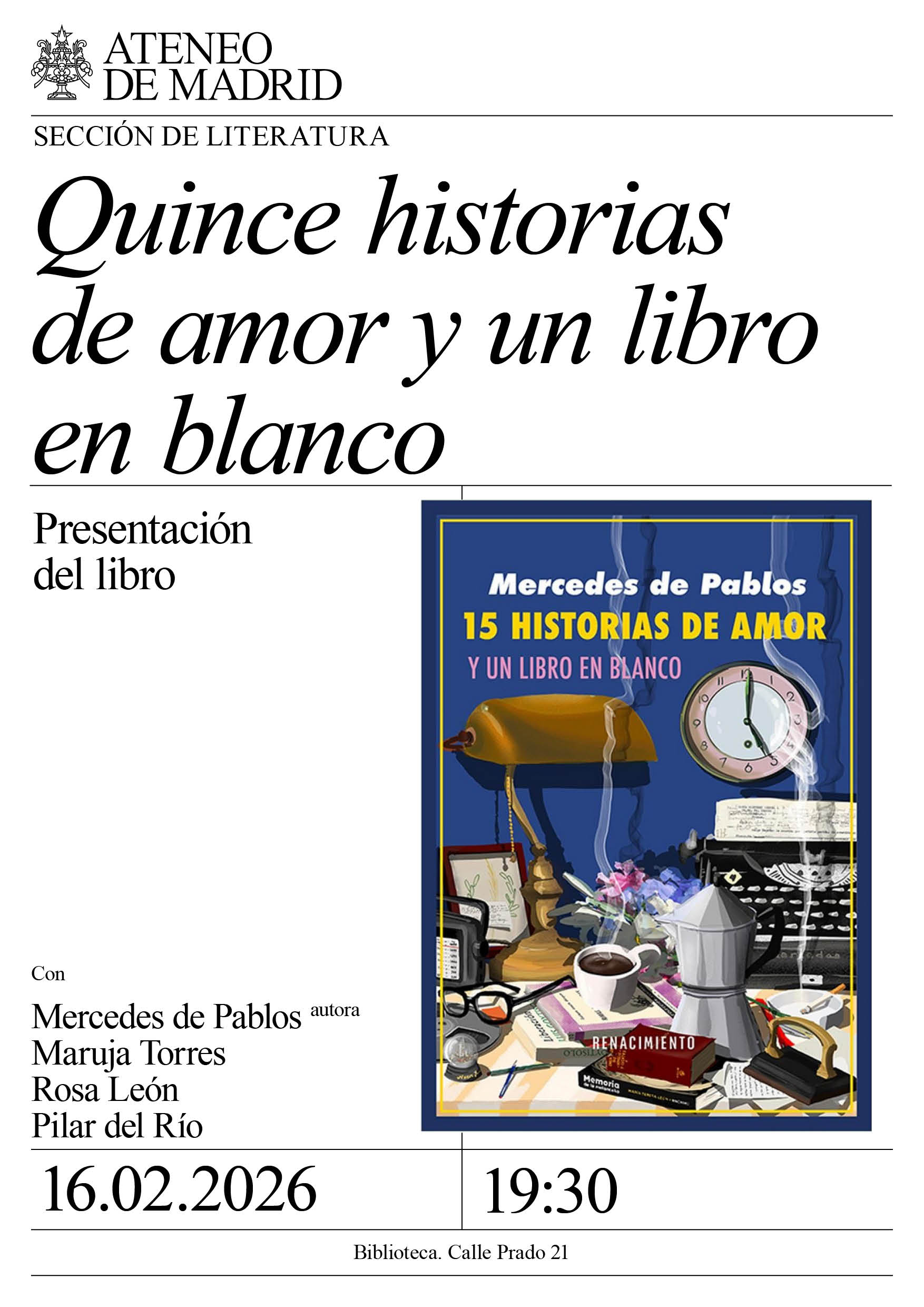 Sección de Literatura. Con: Mercedes de Pablos, autora; Maruja Torres, Rosa León y Pilar del Río, viuda de Saramago. Biblioteca. 19:30h.