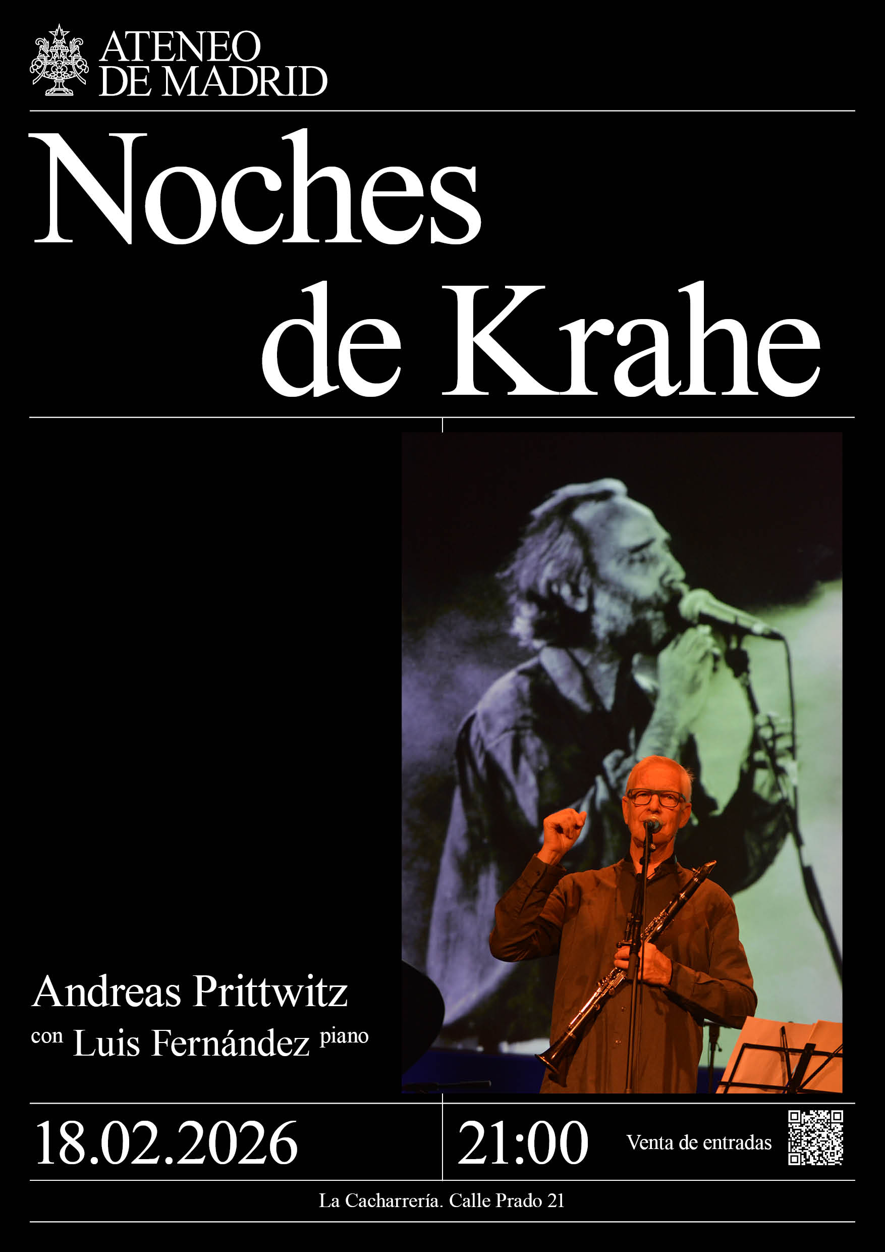 Venta de entradas (aquí). Socios código de descuento en el Área del Socio. Andreas Pritrwitz con Luis Fernández, piano. La Cacharrería. 21:00h.