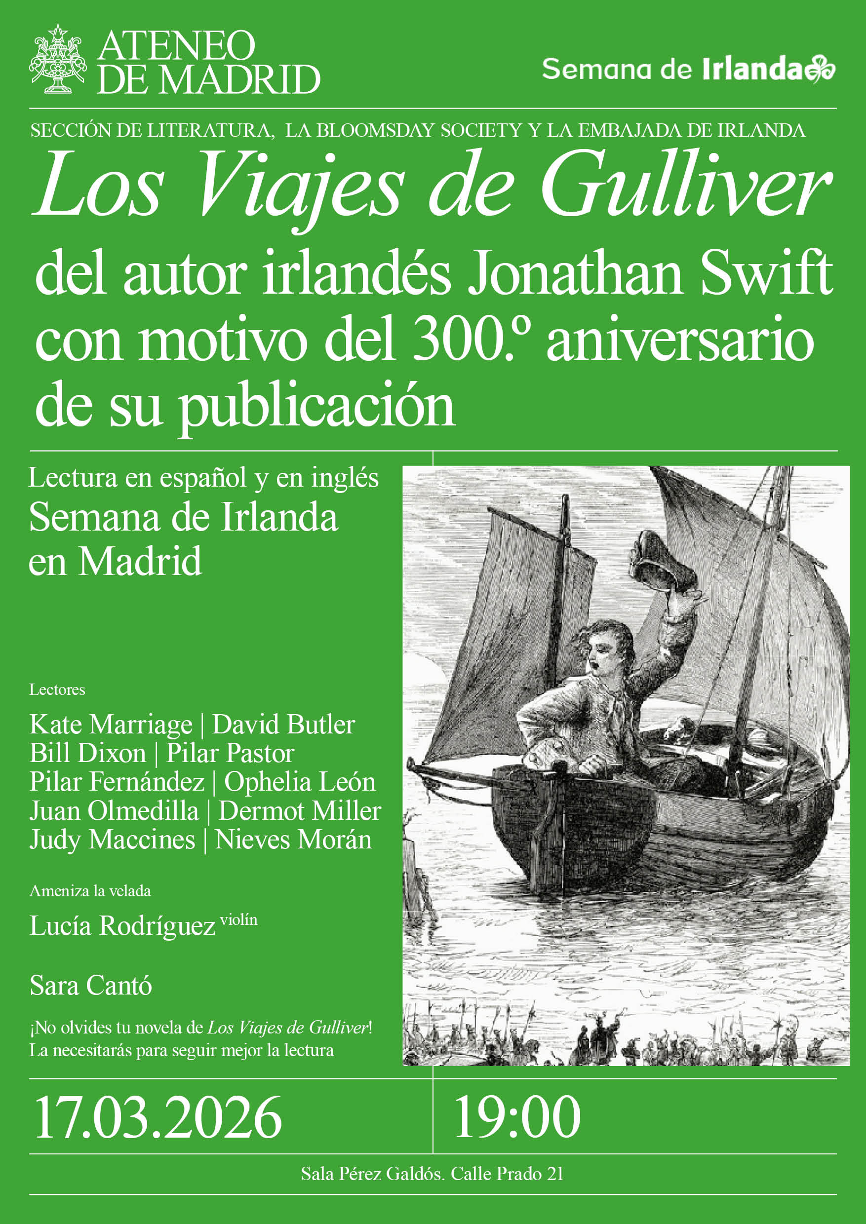 Lectura en español y en inglés. Los joyceanos del Ateneo de Madrid celebran la Semana de Irlanda en Madrid, festividad de San Patricio. Lectores: Kate Marriage, David Butler, Bill Dixon, Pilar Pastor, Pilar Fernández, Ophelia Leon, Juan …
