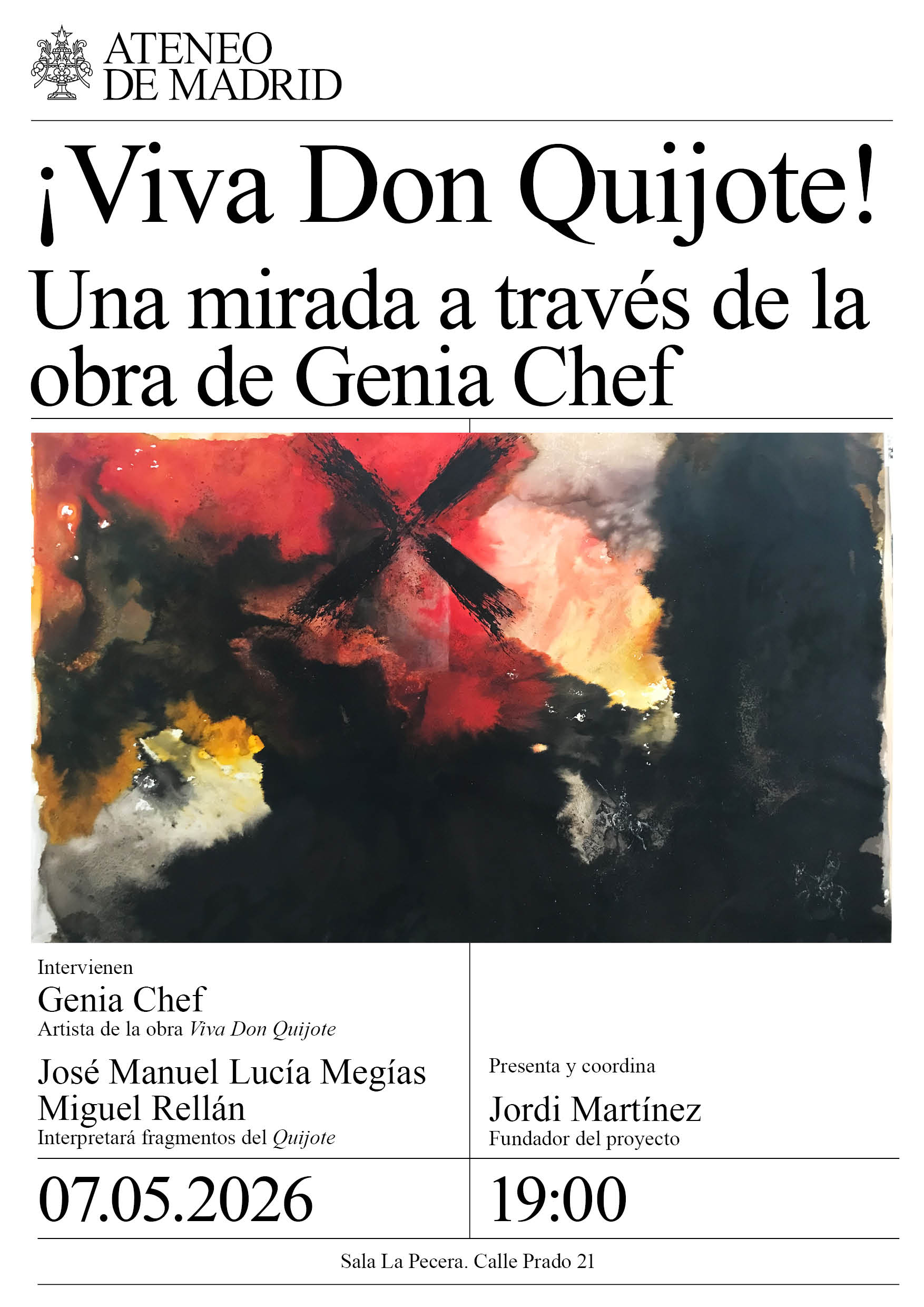 Presenta y coordina: Jordi Martínez, fundador del proyecto. Participantes: Genia Chef, artista de la obra Viva Don Quijote; José Manuel Lucía Megías y Miguel Rellán que interpretará fragmentos del Quijote. Sala La …