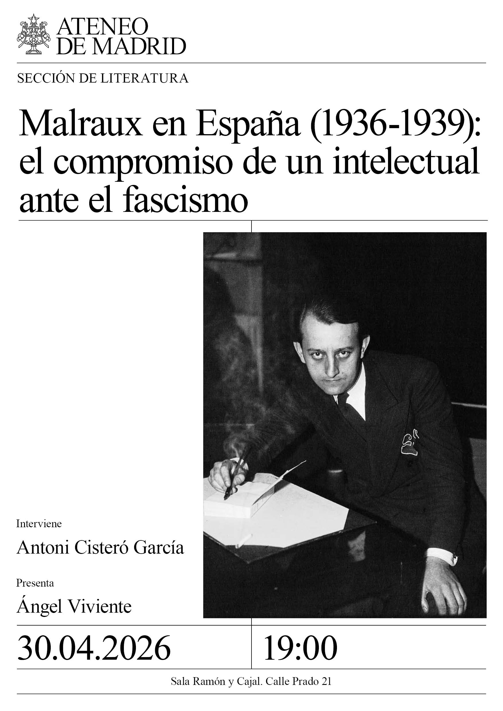 Sección de Literatura. Interviene: Antoni Cisteró García. Presenta: Ángel Viviente. Sala Ramón y Cajal. 19:00h.