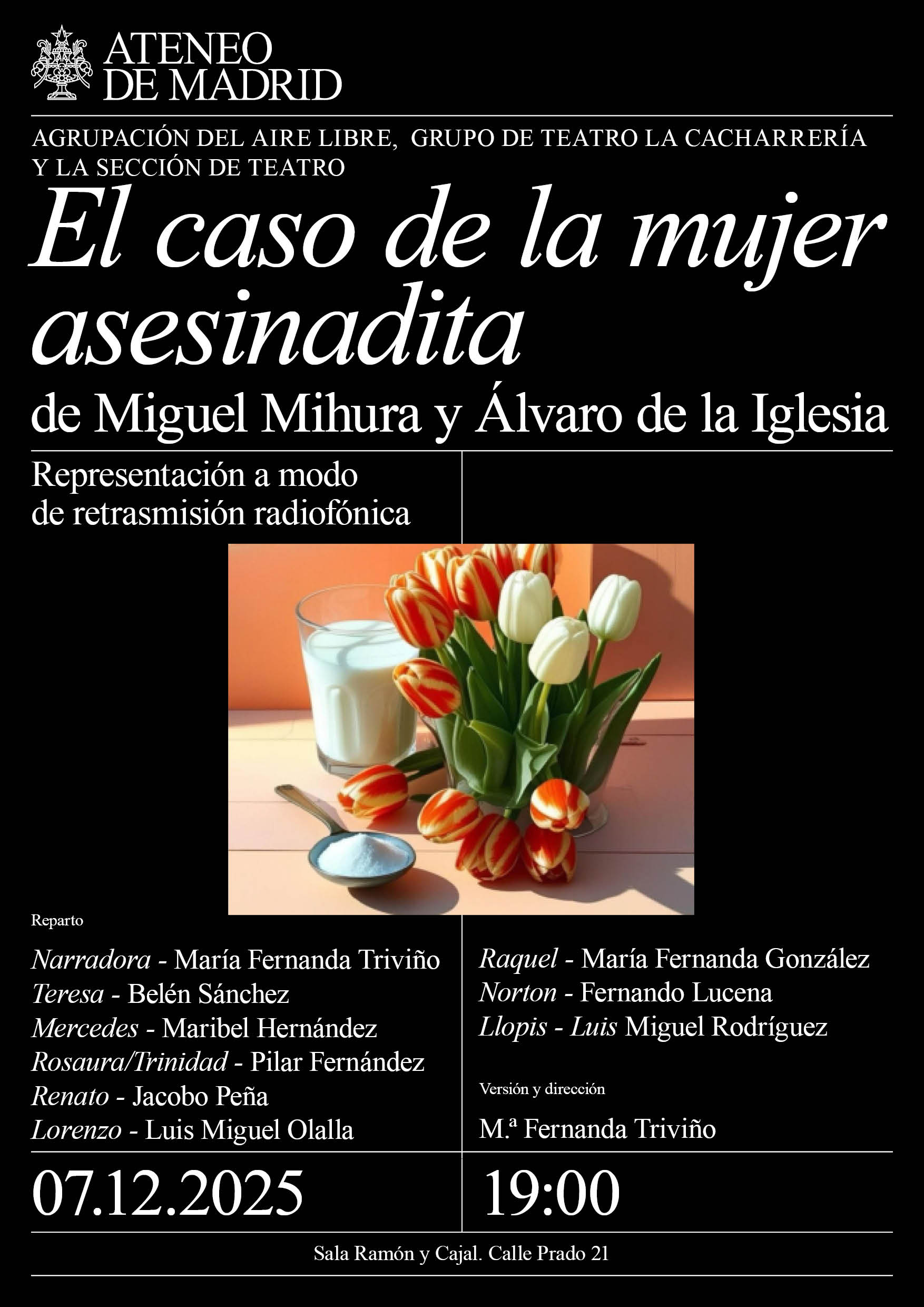 Agrupación del Aire Libre, Grupo de Teatro La Cacharrería y la Sección de Teatro. Sala Ramón y Cajal. 19:00h.Reparto:Narradora - María Fernanda TriviñoTeresa - Belén SánchezMercedes - Maribel HernándezRosaura/Trinidad - Pilar FernándezRenato - Jacobo PeñaLorenzo - Luis Miguel OlallaRaquel - María Fernanda GonzálezNorton - Fernando LucenaLlopis - Luis Miguel RodríguezVersión y dirección: M.ª Fernanda Triviño …