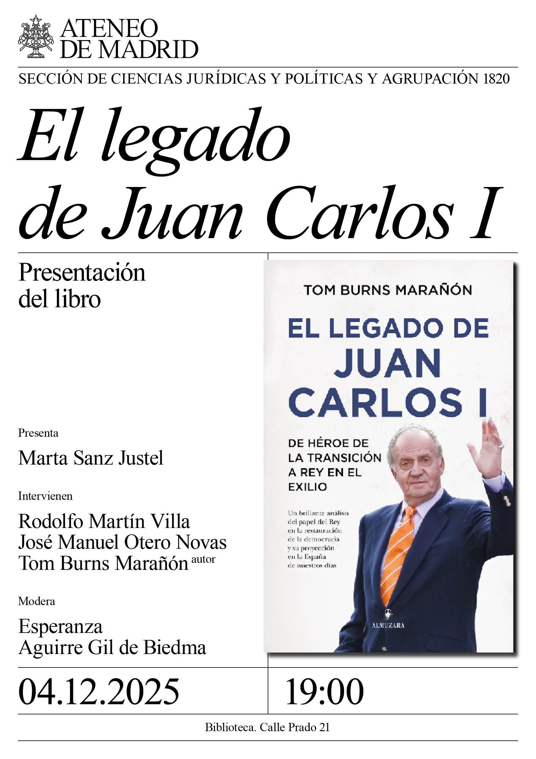 Sección de Ciencias Jurídicas y Políticas y Agrupación 1820. Presenta: Marta Sanz Justel. Intervienen: Rodolfo Martín Villa, José Manuel Otero Novas, Tom Burns Marañón, autor. Modera: Esperanza Aguirre Gil de Biedma. Biblioteca. 19:00h.
