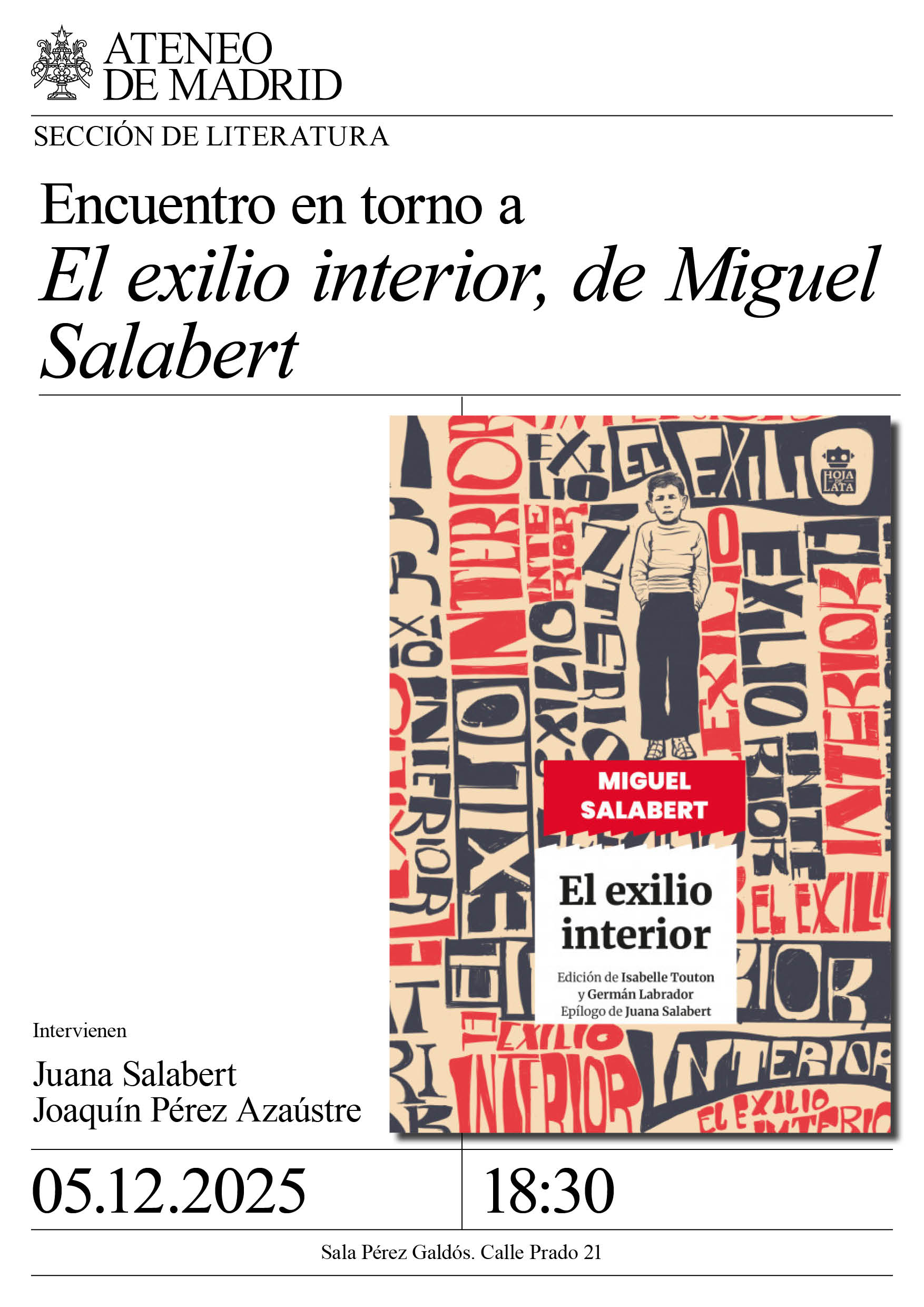 Intervienen: Juana Salabert y Joaquín Pérez Azaústre. Sala Pérez Galdós. 18:30h.