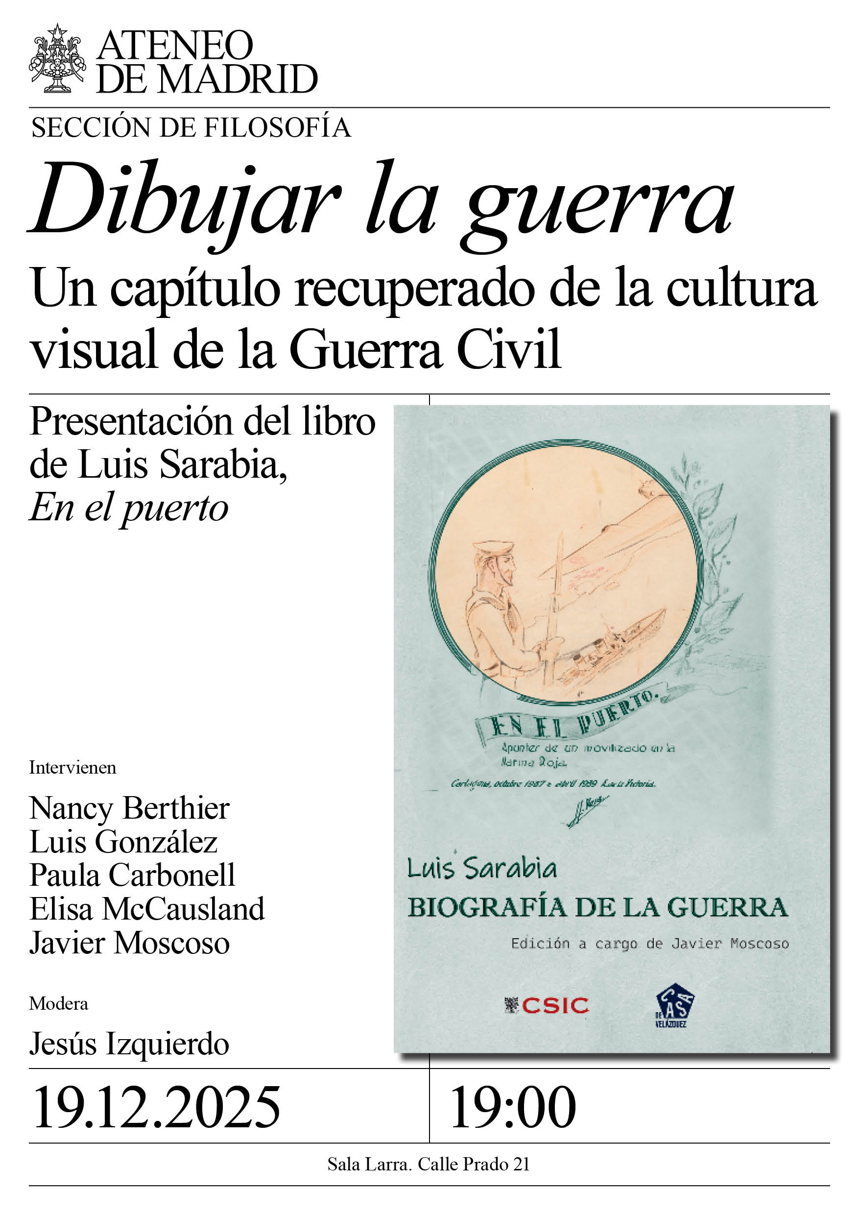 Sección de Filosofía. Presentación del libro de Luis Sarabia, En el puerto. Intervienen: Nancy Berthier, directora de la Casa de Velázquez; Luis González, director de estudios de Casa Velázquez; Paula Carbonell, artista; Elisa McCausland, escritora; y Javier Moscoso, filósofo; . Modera: Jesús Izquierdo, historiador. Sala Larra. 19:00h.