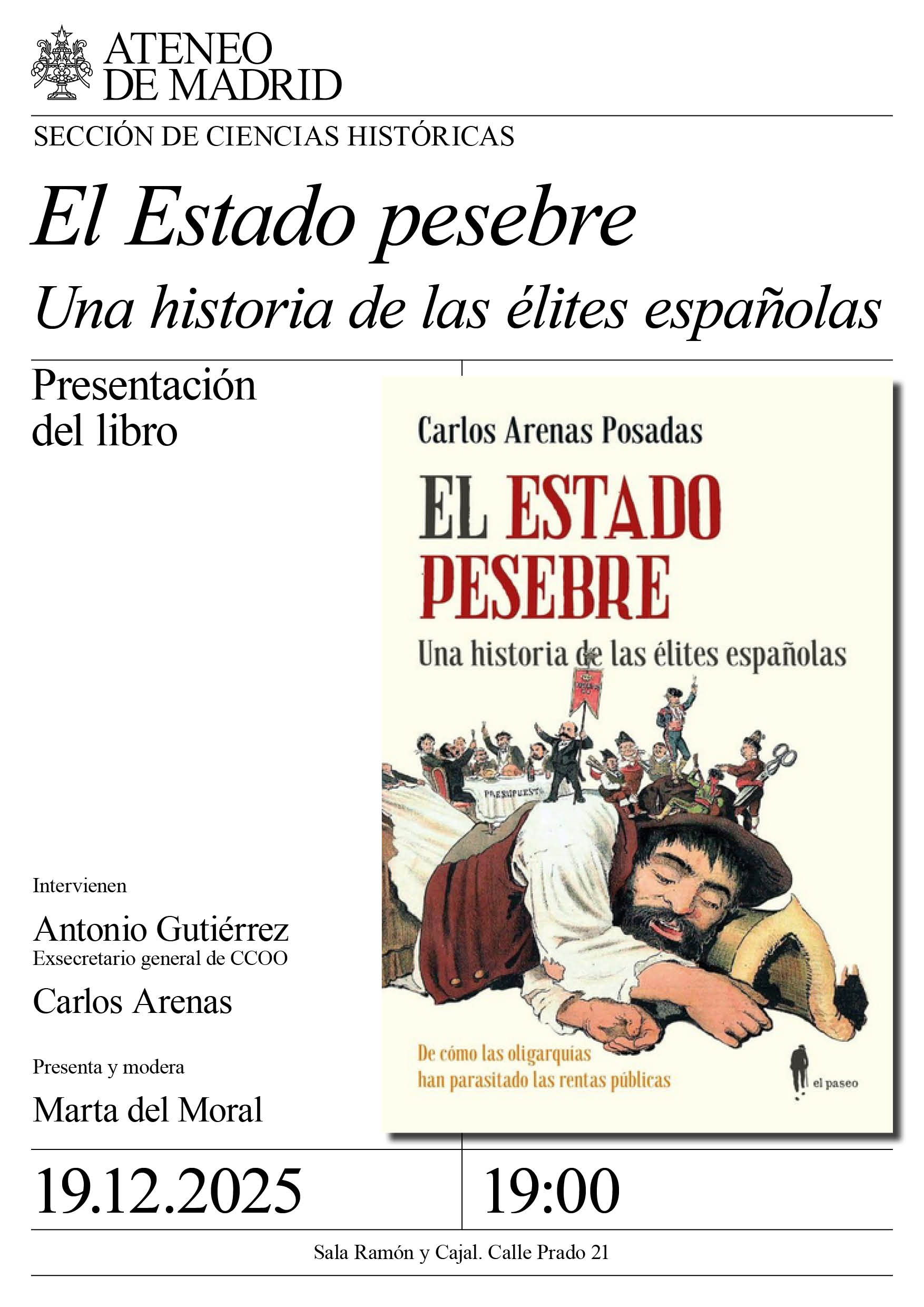 Sección de Ciencias Históricas. Intervienen: Antonio Gutiérrez, doctor en Ciencias Económicas, exsecretario general de CCOO; y Carlos Arenas, profesor de Historia e Instituciones Económicas de la Universidad de Sevilla y autor. Presenta y modera: Marta del Moral, profesora titular de Historia Contemporánea de la Universidad Complutense de Madrid. Sala Ramón y Cajal. 19:00h.