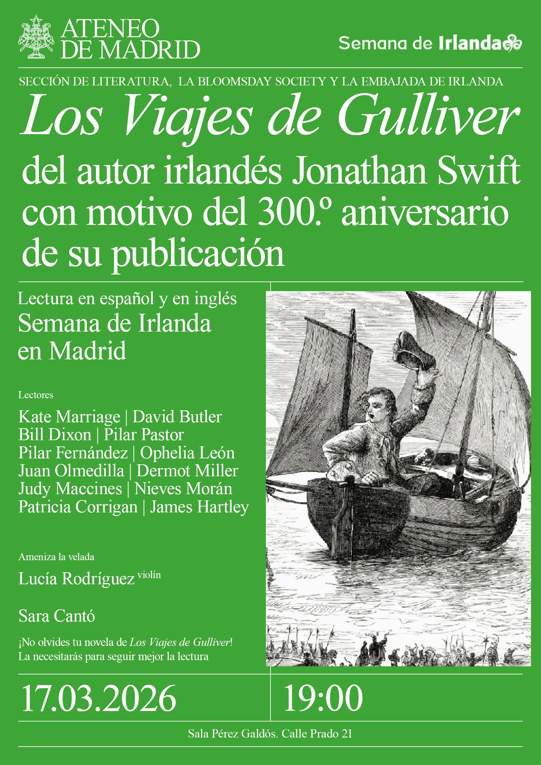 Lectura en español y en inglés. Los joyceanos del Ateneo de Madrid celebran la Semana de Irlanda en Madrid, festividad de San Patricio. Lectores: Kate Marriage, David Butler, Bill Dixon, Pilar Pastor, Pilar Fernández, Ophelia Leon, Juan Olmedilla, Dermot Miller, Judy Maccines, Nieves Morán, Patricia Carrigan y James Hartley. Ameniza la velada: Lucía Rodríguez, violín. Presenta: Sara …