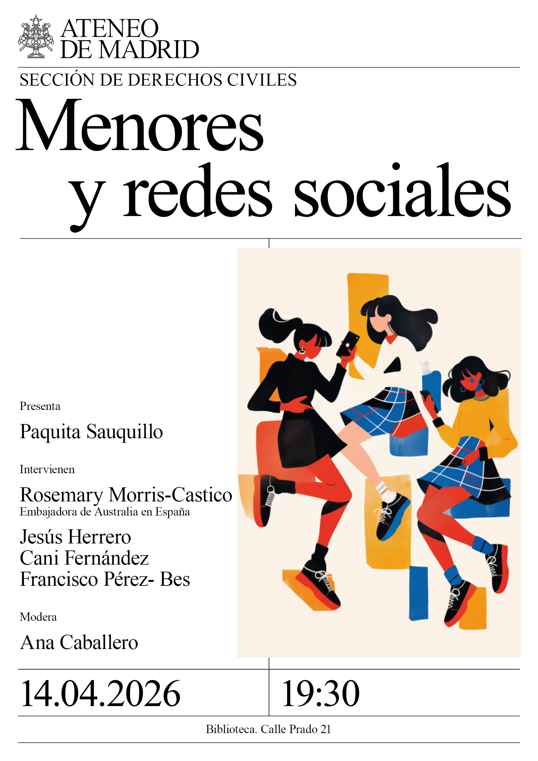 Sección de Literatura. Intervienen: Ángeles Caballero, periodista y escritora; Ana Conseglieri, presidenta de la Asociación Española de Neuropsiquiatría y psiquiatra Hospital Infanta Cristina: Agustín García Matilla, vicerrector Universidad de Valladolid y catedrático Comunicación Audiovisual; María Garralón, actriz y Manuel Valdivia, autor de la novela. Sala Larra. 19:30h.