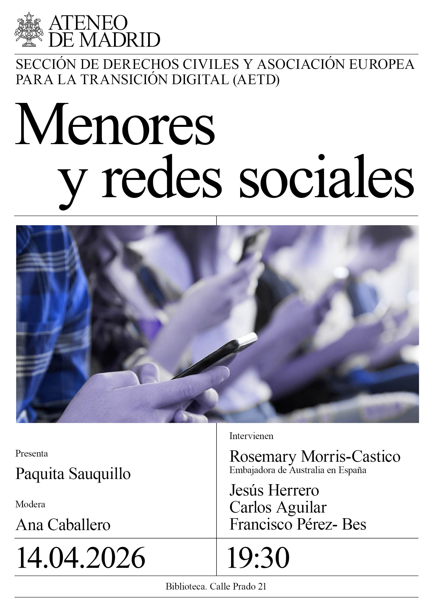 Sección de Derechos Civiles. Presenta: Paquita Sauquillo. Intervienen: Rosemary Morris-Castico, embajadora de Australia en España; Jesús Herrero, director General de Red.es; Carlos Aguilar, consejero de la CNMC; y Francisco Pérez- Bes, adjunto a Presidencia de la AEPD. Modera: Dña. Ana Caballero, vicepresidenta de la AETD. Biblioteca. 19:30h.