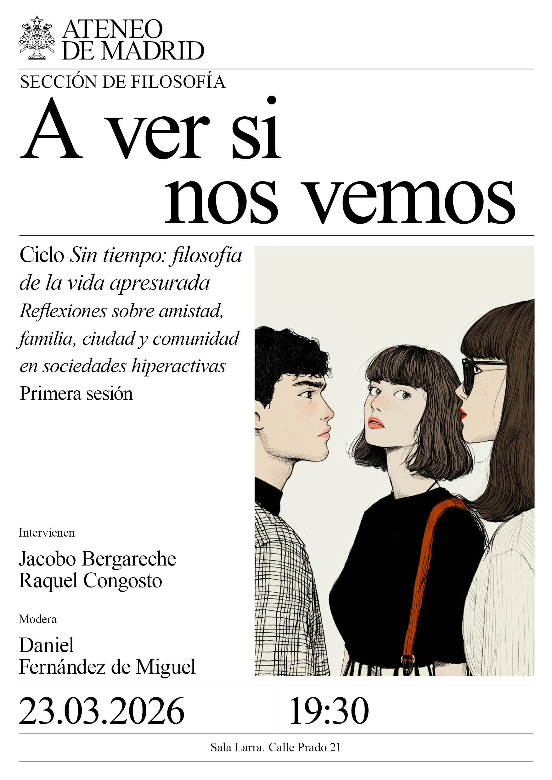 Sección de Filosofía. Reflexiones sobre amistad, familia, ciudad y comunidad en sociedades hiperactivas 1ª sesión. Intervienen: Jacobo Bergareche y Raquel Congosto. Modera: Daniel Fernández de Miguel. Sala Larra. 19:30h.