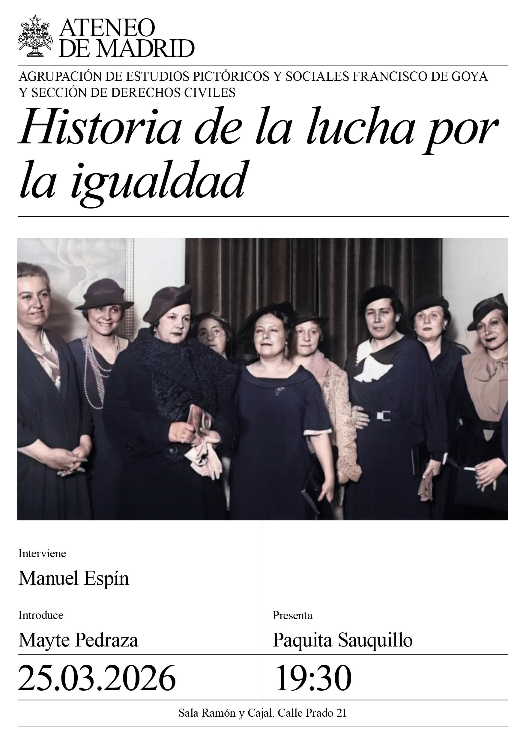 Agrupación de Estudios Pictóricos Goya y Sección de Derechos Civiles. Interviene: Manuel Espín. Introduce: Mayte Pedraza. Presenta: Paquita Sauquillo. Sala Ramón y Cajal. 19:30h.