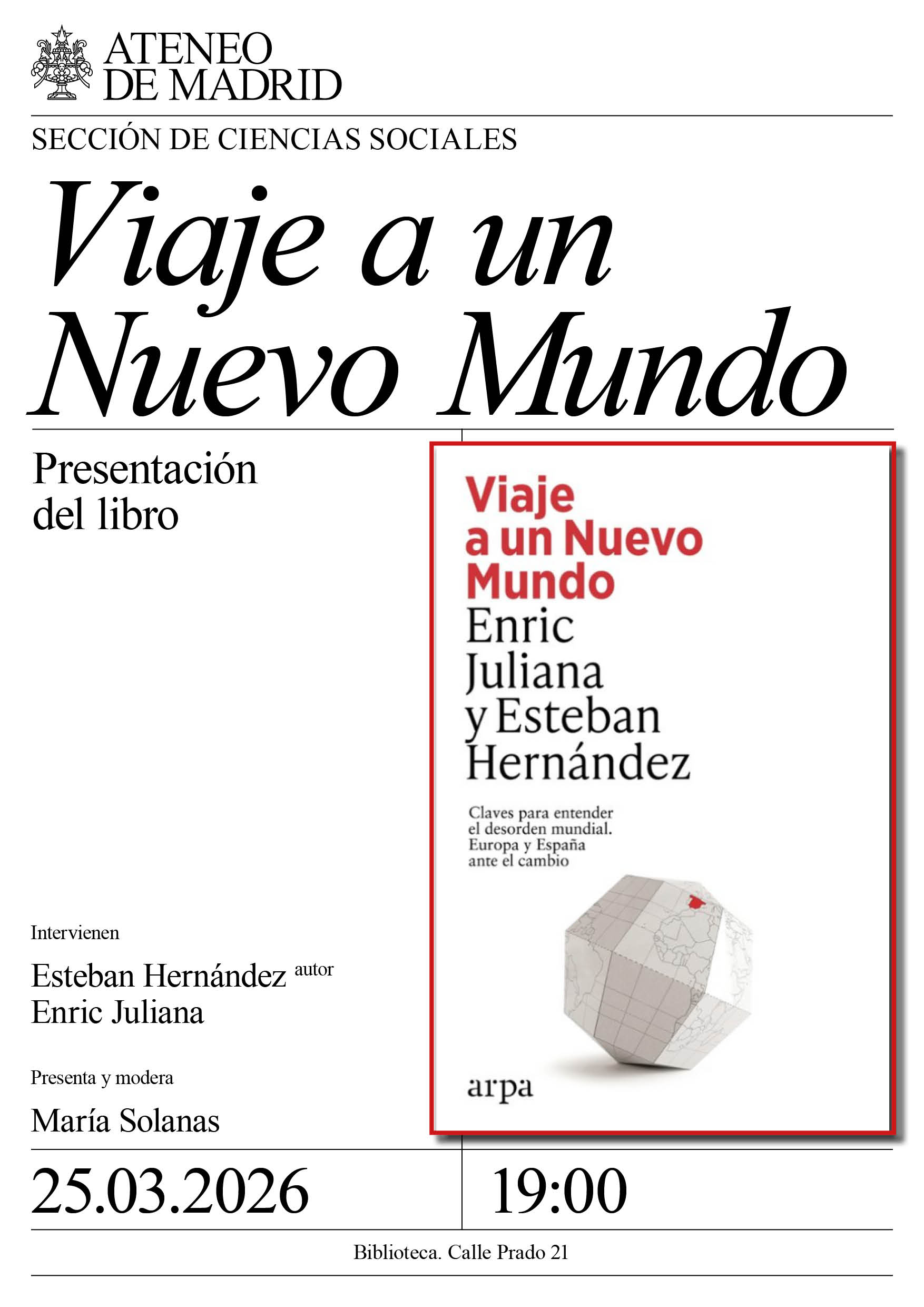 Sección de Ciencias Sociales. Intervienen: Esteban Hernández, autor y Enric Juliana. Presenta y modera: María Solanas. Directora programas Real Instituto El Cano. Biblioteca. 19:00h.