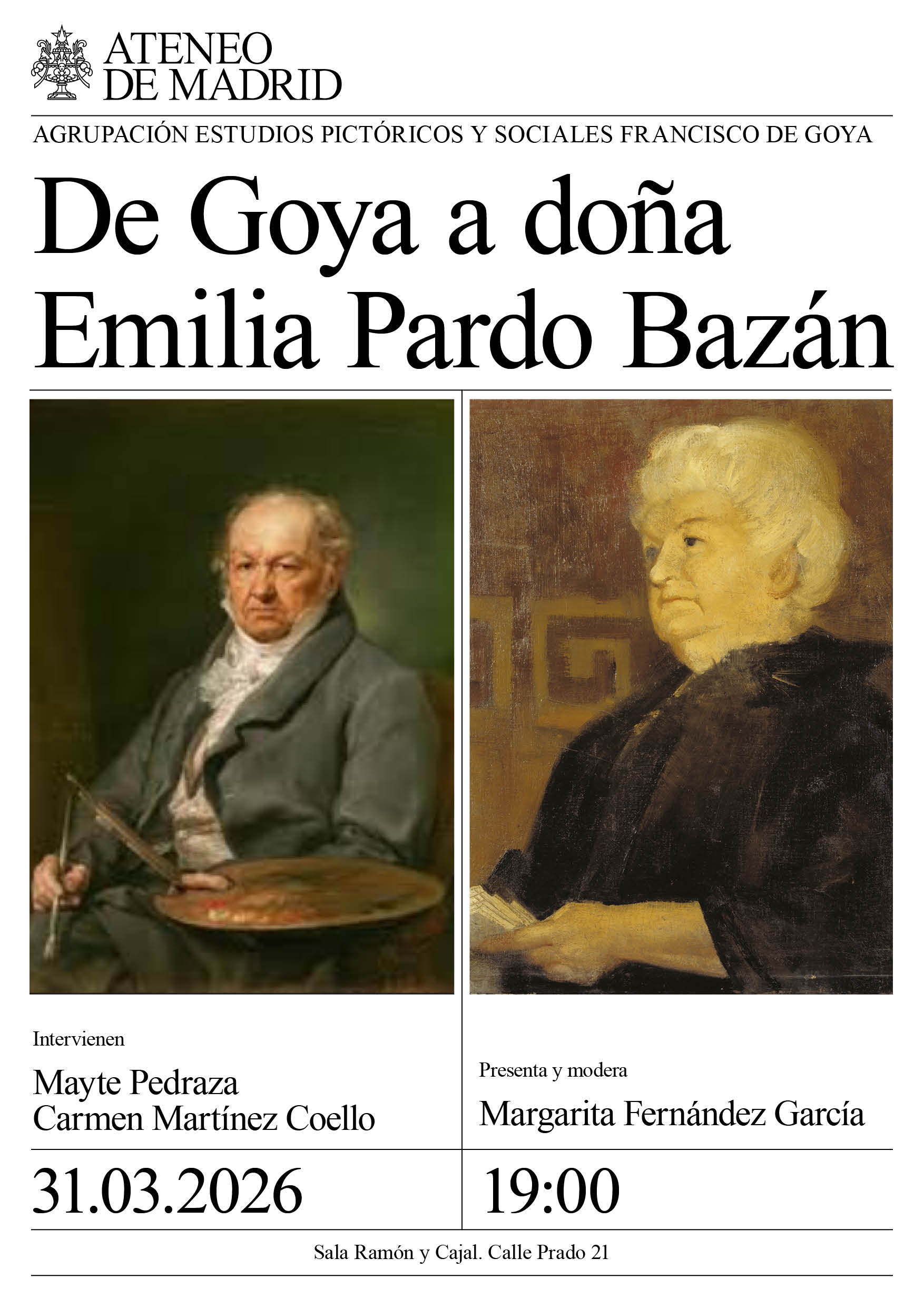 Agrupación Estudios pictóricos y sociales Francisco de Goya. Intervienen: Mayte Pedraza y Carmen Martínez Coello. Presenta y modera: Margarita Fernández García. Sala Ramón y Cajal. 19:00h.