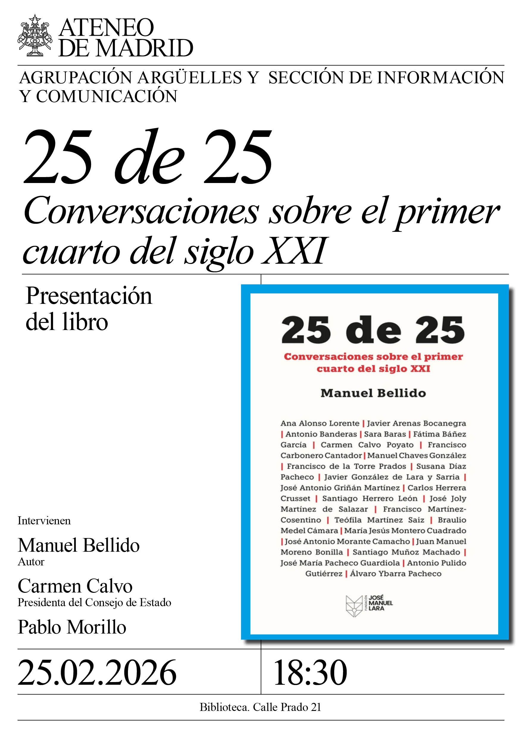 Agrupación Agustín Argüelles y Sección de Información y Comunicación. Intervienen: Manuel Bellido, autor Carmen Calvo, presidenta del Consejo de Estado y Pablo Morillo, director de la Fundación José Manuel Lara. Biblioteca. 18:30h.