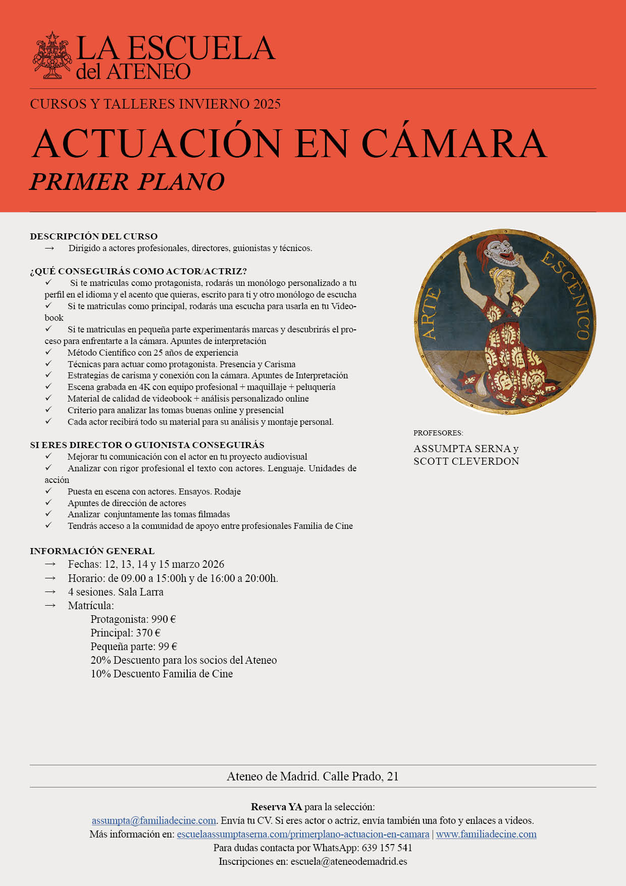 → Reserva YA para la selección: assumpta@familiadecine.com. Envía tu CV. Si eres actor o actriz, envía también una foto y enlaces a videos. Más información en: escuelaassumptaserna.com/primerplano-actuacion-en-camara | www.familiadecine.com. Para dudas contacta por WhatsApp: 639 157 541.