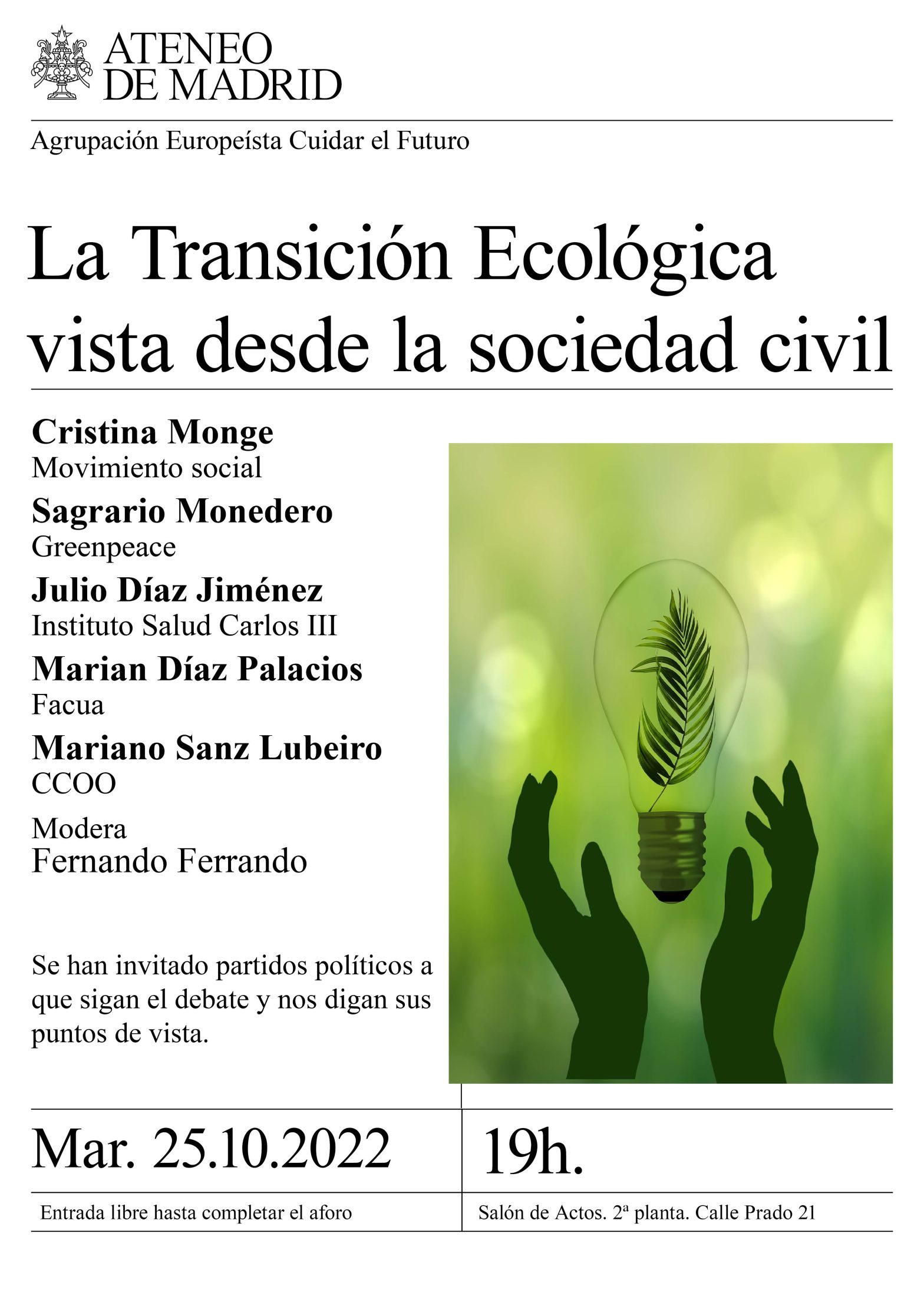 Agrupación Europeísta Cuidar el Futuro. Cristina Monge. Movimiento social. Sagrario Monedero. Greenpeace. Julio Díaz Jiménez. Instituto Salud Carlos III. Marian Díaz Palacios. Facua. Mariano Sanz Lubeiro. CCOO. Modera: Fernando Ferrando Se han invitado partidos políticos a que sigan el debate y nos digan sus puntos de vista. Salón de Actos.